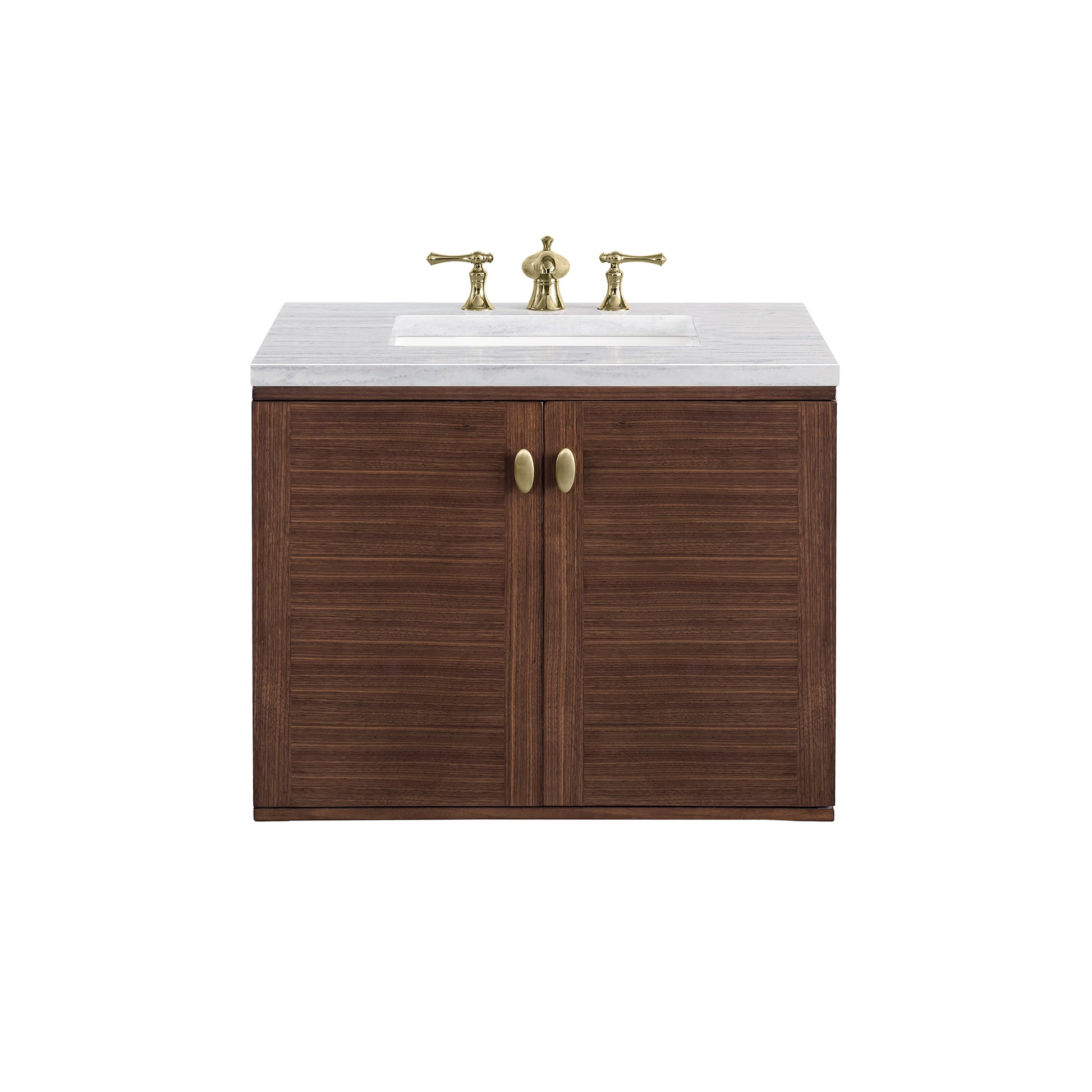 The 30" Amberly Single Vanity celebrates Mid-Century simplistic forms and finish details combined with practical function. The beauty of the natural grains in the walnut veneer steals the show, while the decorative, oval knobs in Champagne Brass provide the perfect accent. This two-door cabinet opens to a spacious interior with a single shelf and a convenient USB/Electric power outlet. The elegant wood base elevates the Vanity Cabinet in a true console style, though you may choose the more modern, space-saving wall-mount option. The 3 cm, eased edge Arctic Fall Solid Surface top completes the look.