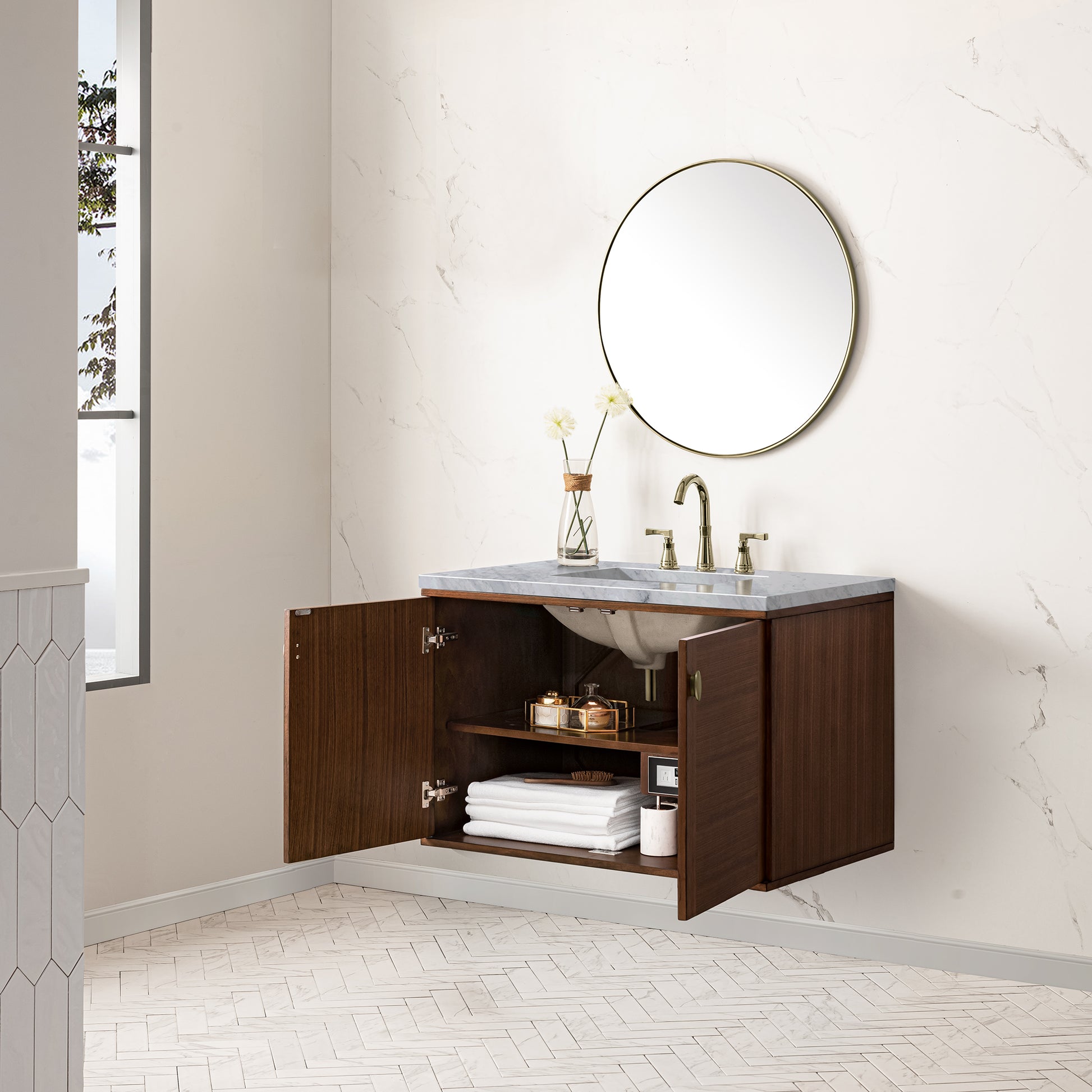 The 36" Amberly Single Vanity celebrates Mid-Century simplistic forms and finish details combined with practical function. The beauty of the natural grains in the walnut veneer steals the show, while the decorative, oval knobs in Champagne Brass provide the perfect accent. This two-door cabinet opens to a spacious interior with a single shelf and a convenient USB/Electric power outlet. The elegant wood base elevates the Vanity Cabinet in a true console style, though you may choose the more modern, space-saving wall-mount option. The 3 cm, eased-edge Carrara marble top completes the look.