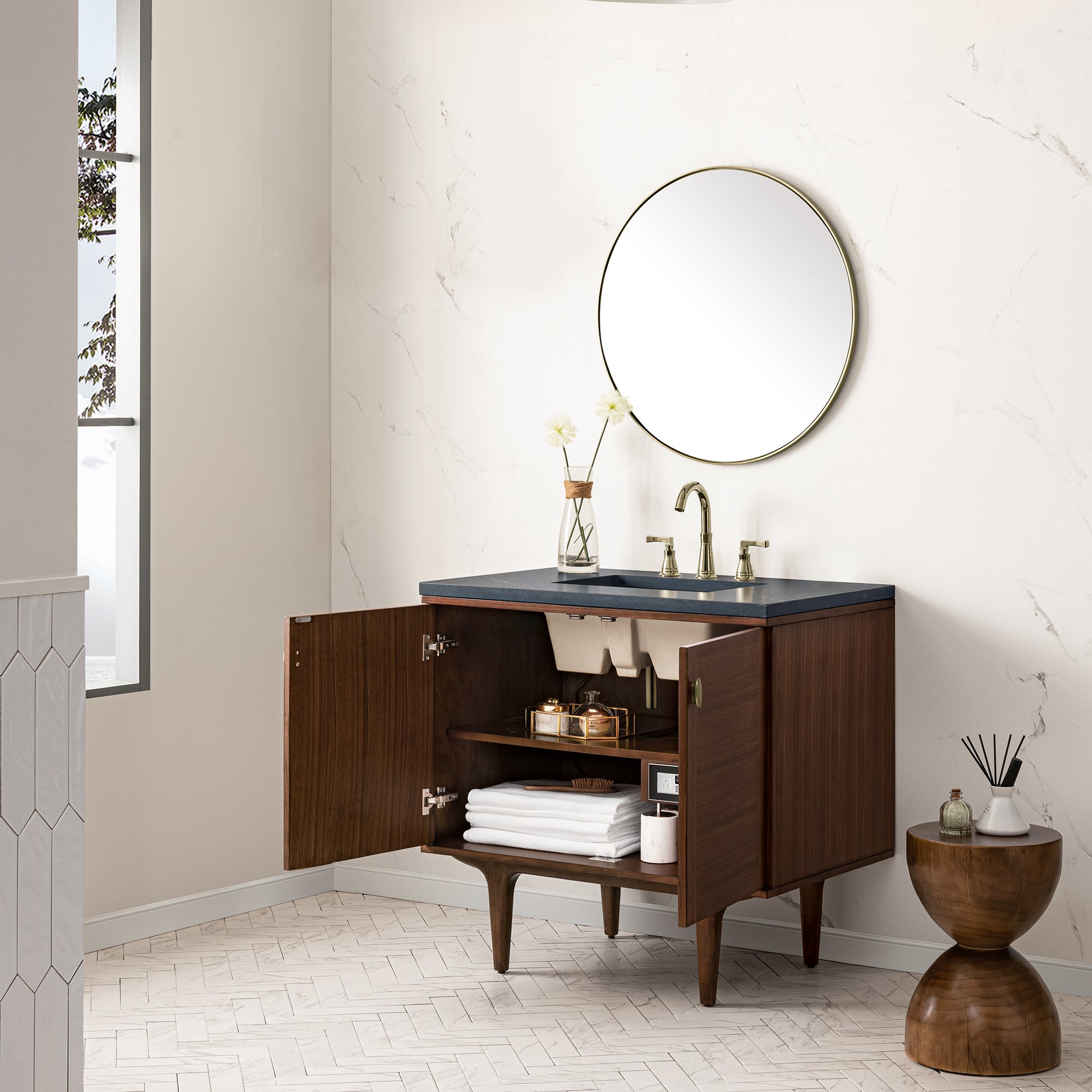 The 36" Amberly Single Vanity celebrates Mid-Century simplistic forms and finish details combined with practical function. The beauty of the natural grains in the walnut veneer steals the show, while the decorative, oval knobs in Champagne Brass provide the perfect accent. This two-door cabinet opens to a spacious interior with a single shelf and a convenient USB/Electric power outlet. The elegant wood base elevates the Vanity Cabinet in a true console style, though you may choose the more modern, space-saving wall-mount option. The 3 cm, eased-edge Charcoal Soapstone Silestone top completes the look.