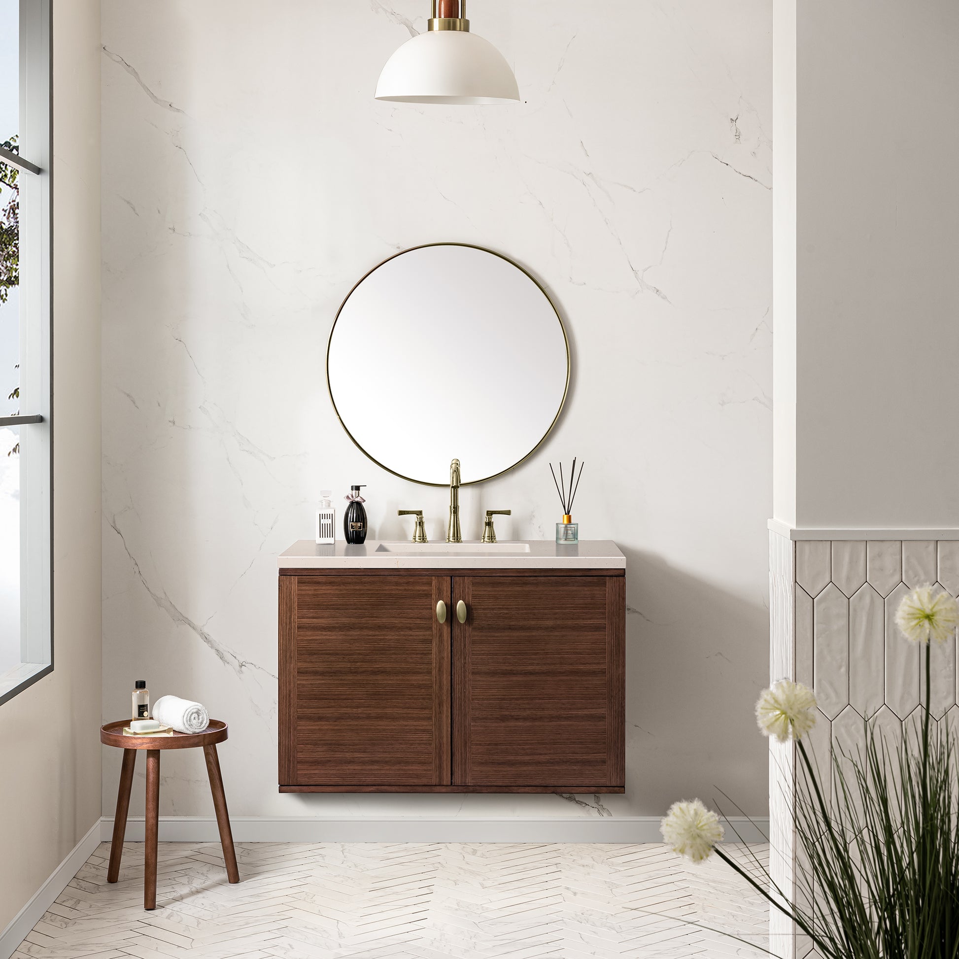 The 36" Amberly Single Vanity celebrates Mid-Century simplistic forms and finish details combined with practical function. The beauty of the natural grains in the walnut veneer steals the show, while the decorative, oval knobs in Champagne Brass provide the perfect accent. This two-door cabinet opens to a spacious interior with a single shelf and a convenient USB/Electric power outlet. The elegant wood base elevates the Vanity Cabinet in a true console style, though you may choose the more modern, space-saving wall-mount option. The 3 cm, eased edge Eternal Marfil Silestone top completes the look.