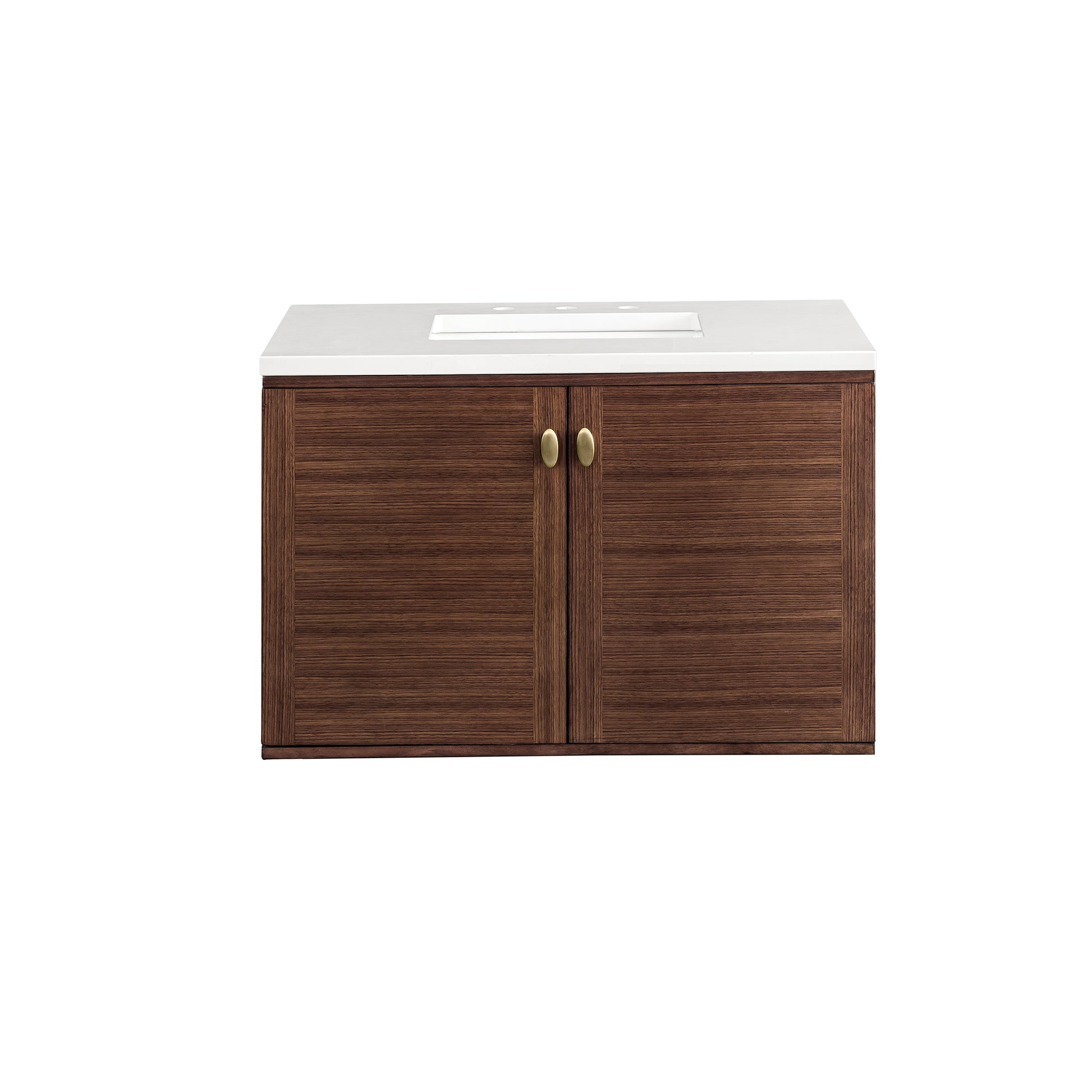 The 36" Amberly Single Vanity celebrates Mid-Century simplistic forms and finish details combined with practical function. The beauty of the natural grains in the walnut veneer steals the show, while the decorative, oval knobs in Champagne Brass provide the perfect accent. This two-door cabinet opens to a spacious interior with a single shelf and a convenient USB/Electric power outlet. The elegant wood base elevates the Vanity Cabinet in a true console style, though you may choose the more modern, space-saving wall-mount option. The 3 cm, eased edge White Zeus Silestone top completes the look.