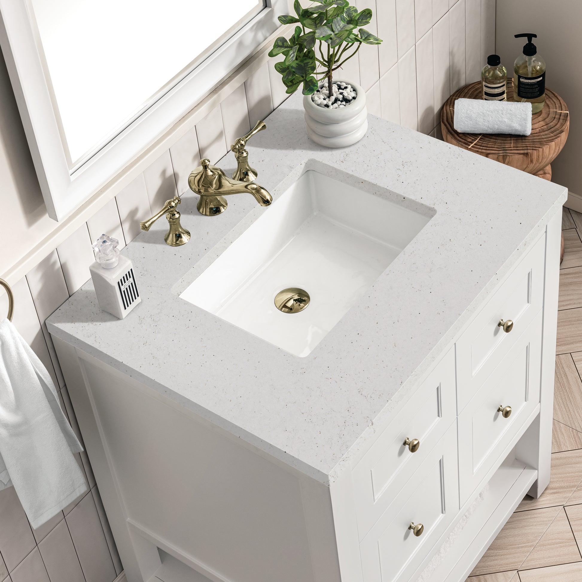 • Bright White finish with Champagne Brass hardware