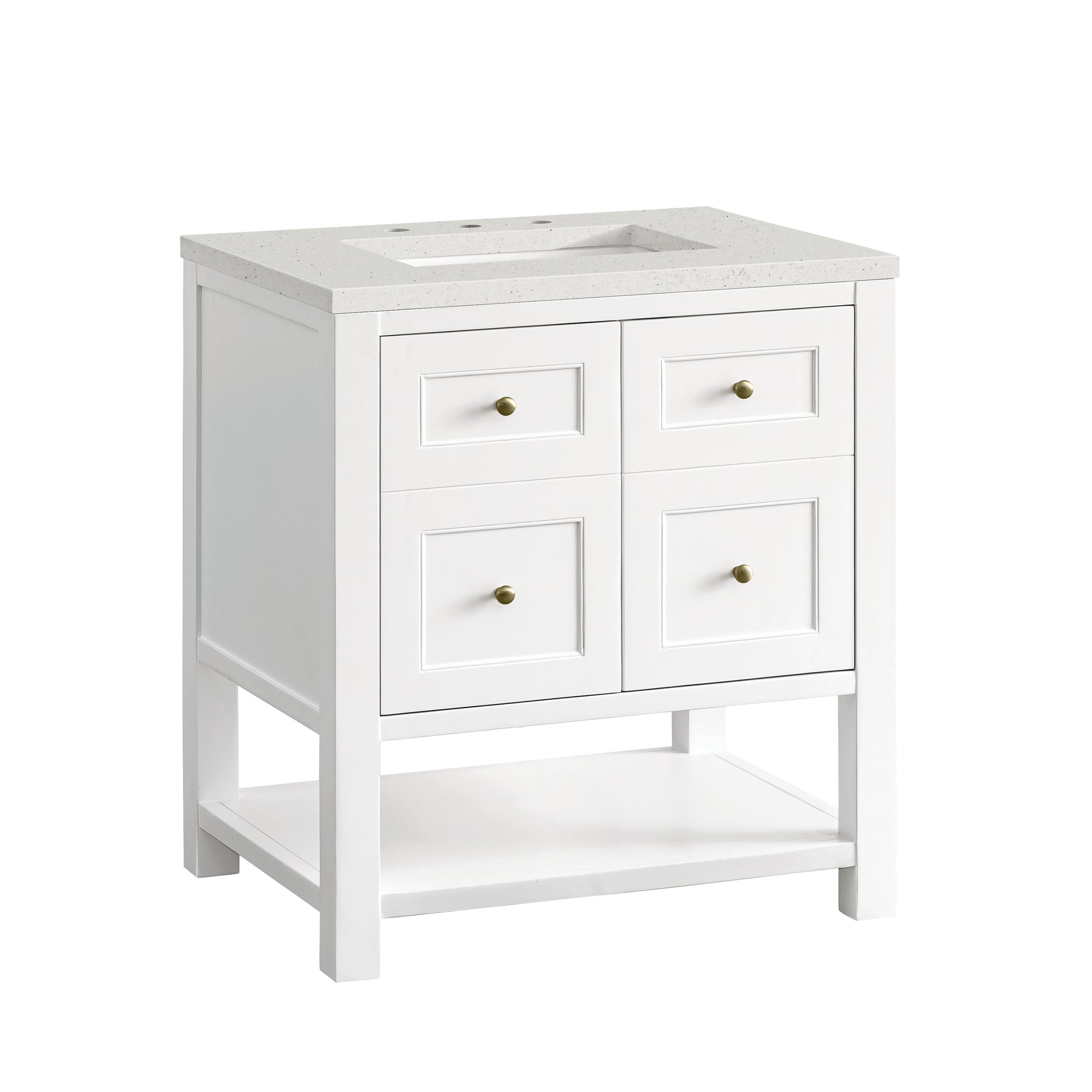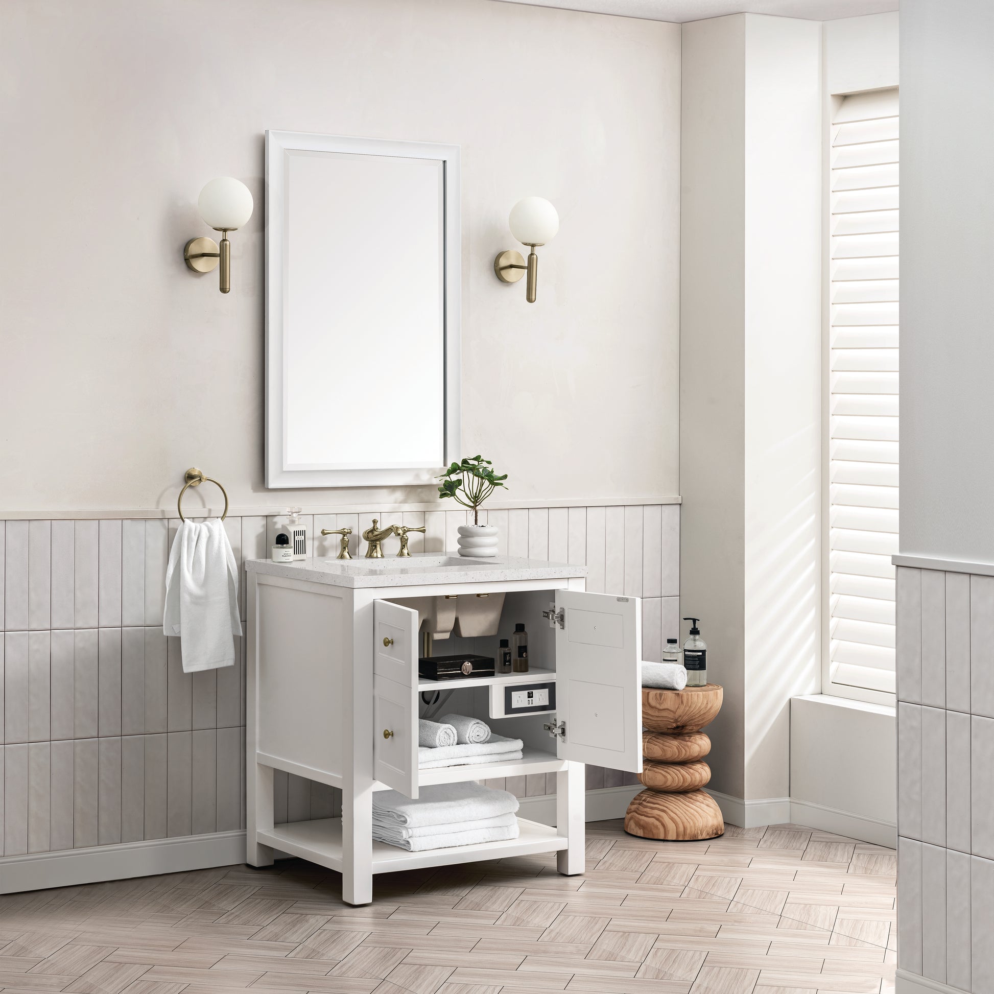 The Breckenridge 30" Single Vanity is a fresh take on traditional Mission furniture that easily transitions to Modern Farmhouse style with an air of understated sophistication. Champagne Brass knobs complement the Bright White finish, while the neatly inset door and drawer fronts lend a fresh appeal to this clean-lined classic. A two-door cabinet opens to reveal an interior shelf equipped with convenient built-in USB/120V power outlet. This console-style vanity also features an open lower shelf for additional storage. A suede-finished Lime Delight Silestone top with undermount sink completes the look.