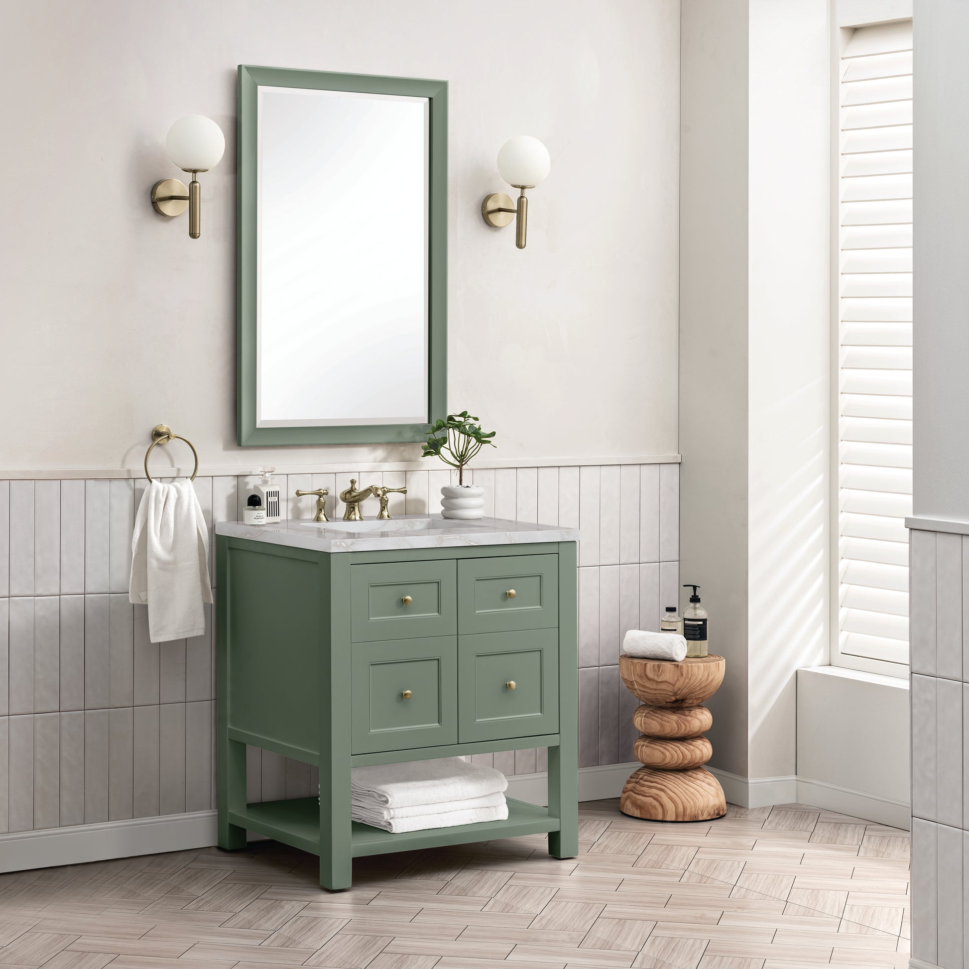 • Smokey Celadon finish with Champagne Brass hardware