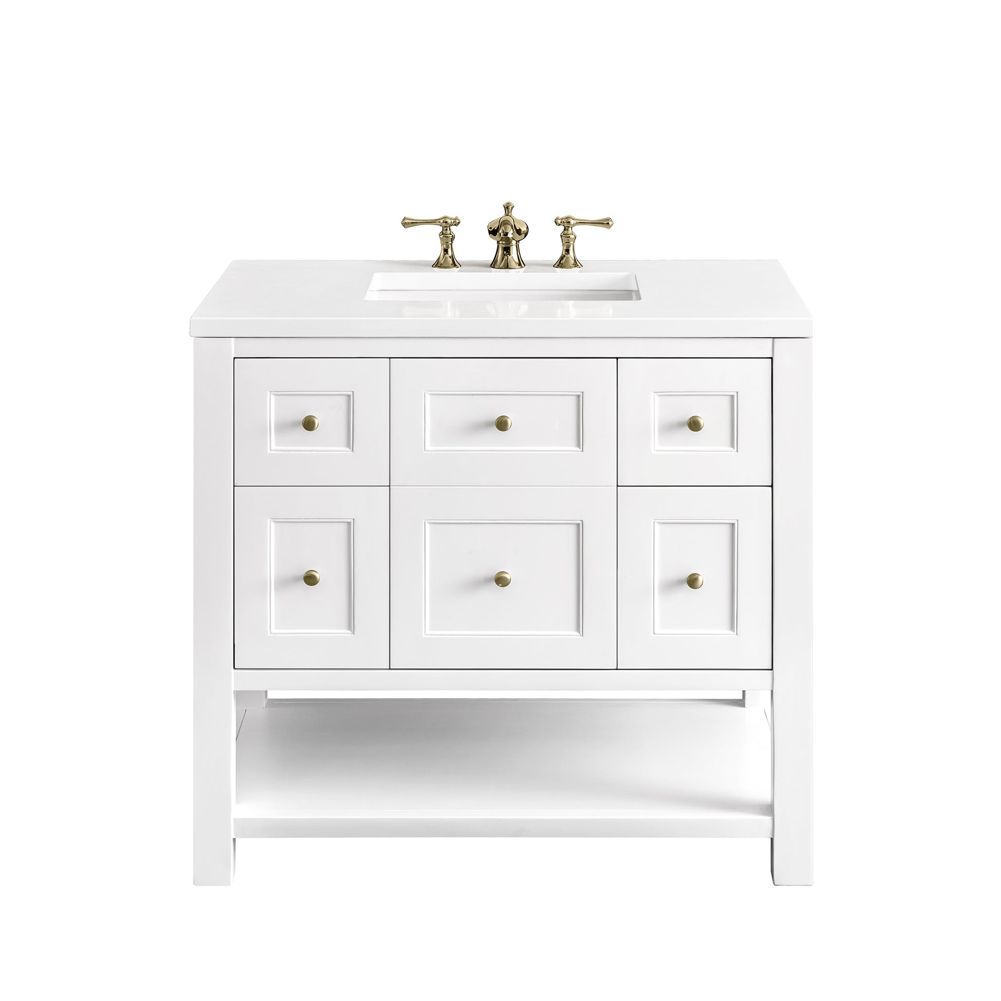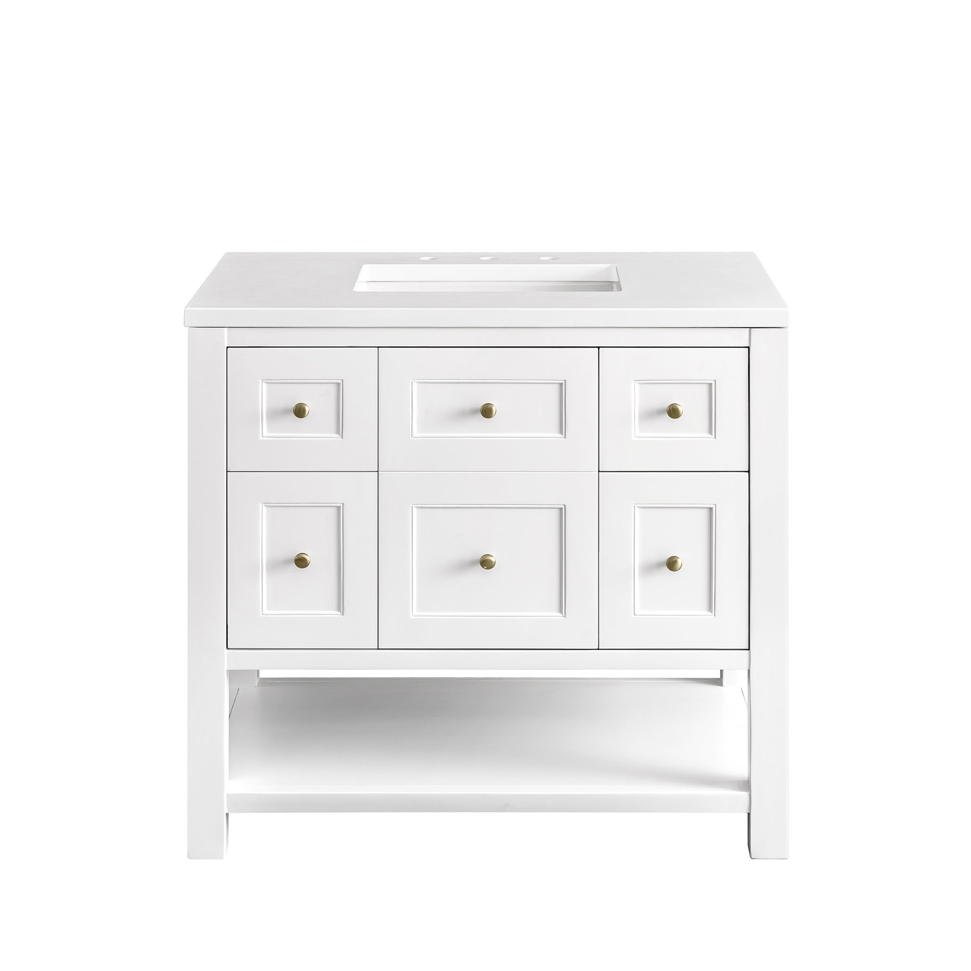 The Breckenridge 36" Single Vanity is a fresh take on traditional Mission furniture that easily transitions to Modern Farmhouse style with an air of understated sophistication. Champagne Brass knobs complement the Bright White finish, while the neatly inset door and drawer fronts lend a fresh appeal to this clean-lined classic. A single-door cabinet opens to reveal an interior shelf equipped with convenient built-in USB/120V power outlet. This console-style vanity also features two top-row tip-out drawers, two standard full-extension drawers, and an open lower shelf for additional storage. A classic White Zeus Silestone top with undermount sink completes the look.