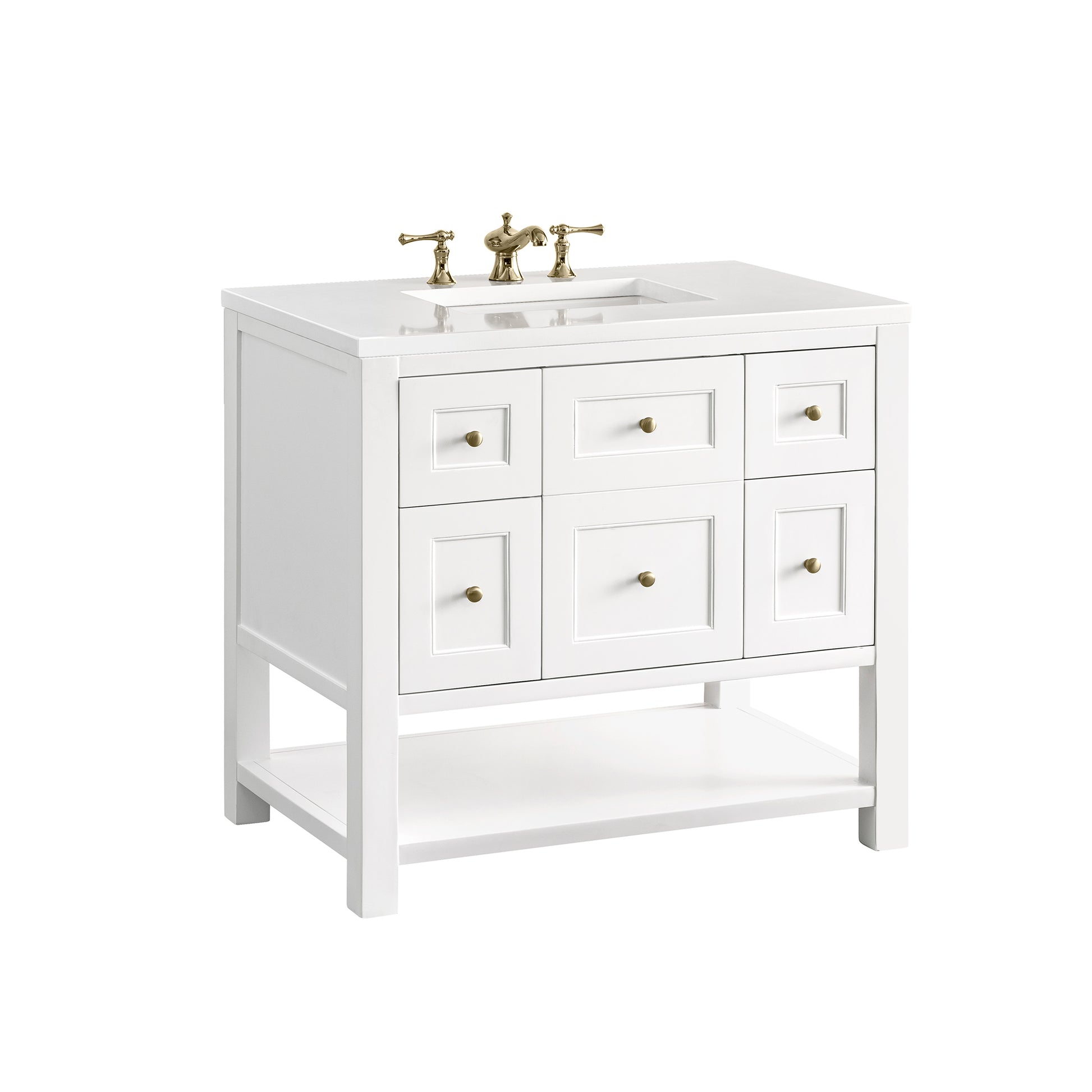 • Bright White finish with Champagne Brass hardware