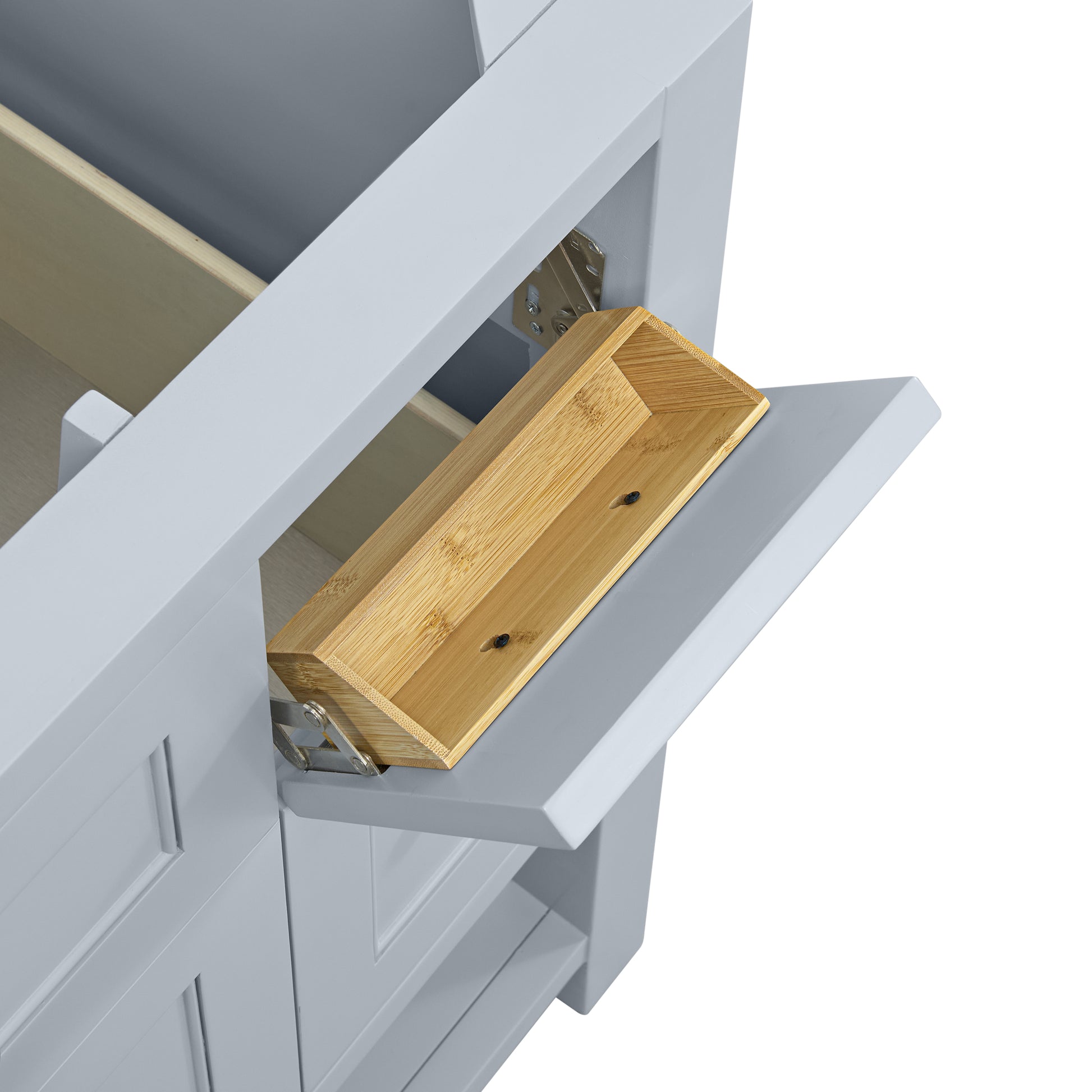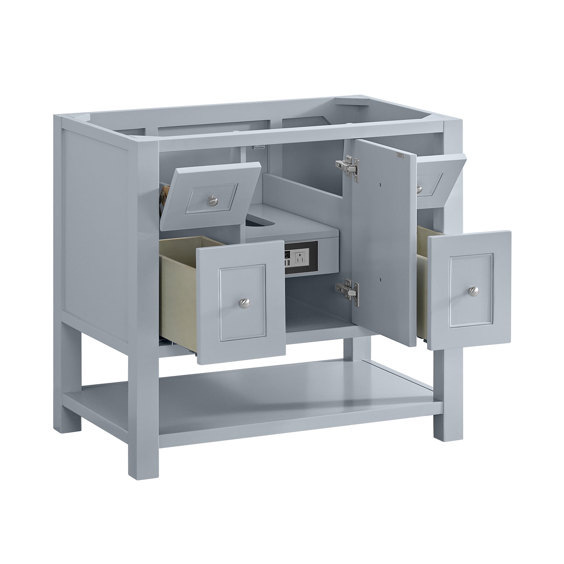 The Breckenridge 36" Single Vanity is a fresh take on traditional Mission furniture that easily transitions to Modern Farmhouse style with an air of understated sophistication. Satin Nickel knobs complement the Serenity Blue finish, while the neatly inset door and drawer fronts lend a fresh appeal to this clean-lined classic. A single-door cabinet opens to reveal an interior shelf equipped with convenient built-in USB/120V power outlet. This console-style vanity also features two top-row tip-out drawers, two standard full-extension drawers, and an open lower shelf for additional storage. A suede-finished Charcoal Soapstone Silestone top with undermount sink completes the look.