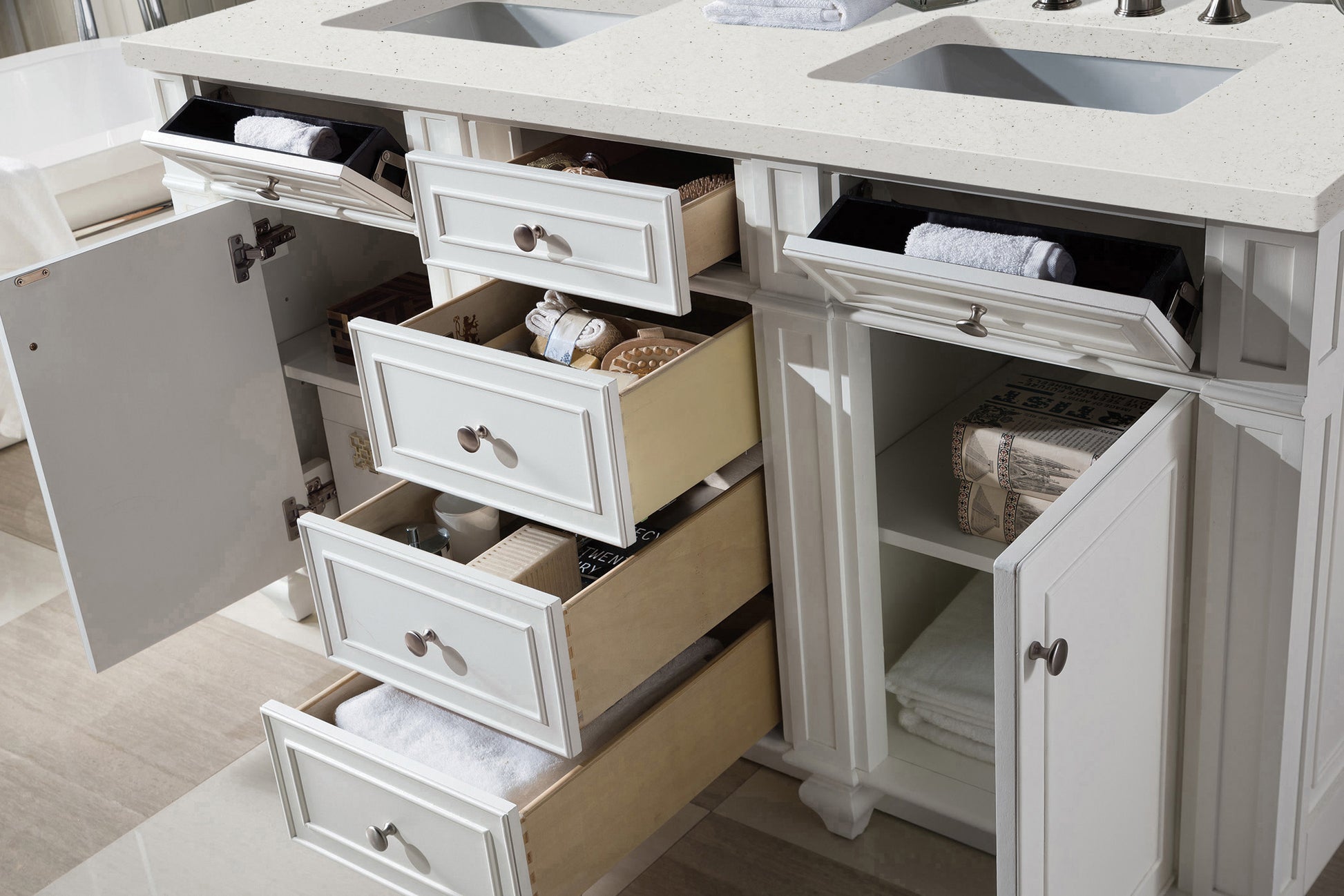 • Two door Bright White double vanity with six drawers and interior shelf space; lower drawer is doubleheight; top outer drawers are tipout style
