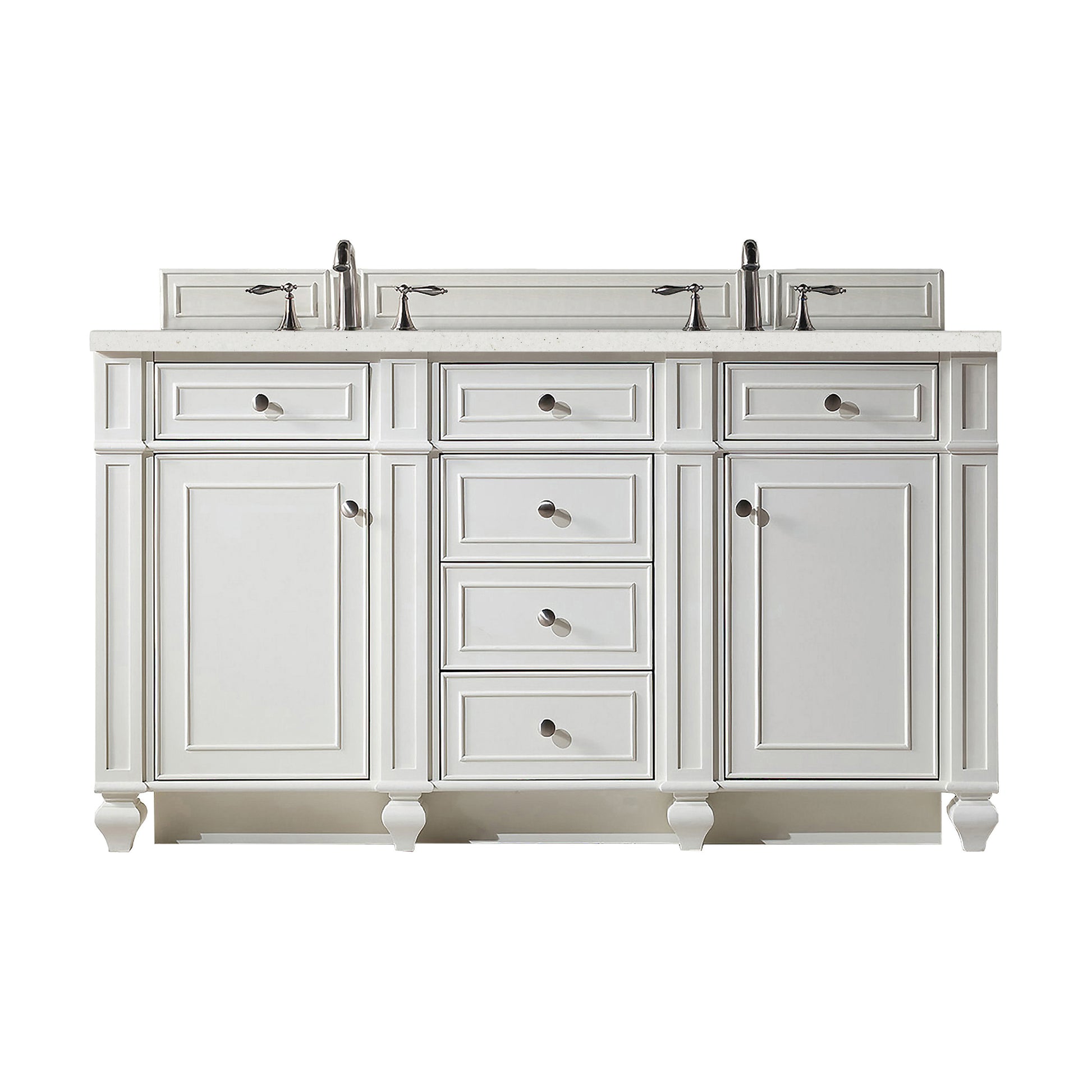 Detailed and distinctive, the Bristol 60" Double Vanity in Bright White features recessed and raised picture frame molding. This two door cabinet with one shelf and seven drawers, lower drawers are "double height", top middle drawer is tip out style. Gracefully supported by tulip-shaped legs, this vanity offers a mix of craftsmanship and functionality. Completed with a Lime Delight Silestone top which lends warm, textured beige tones, the Bristol vanity can complement a variety of decors and is a sophisticated vanity solution for your small bathroom.