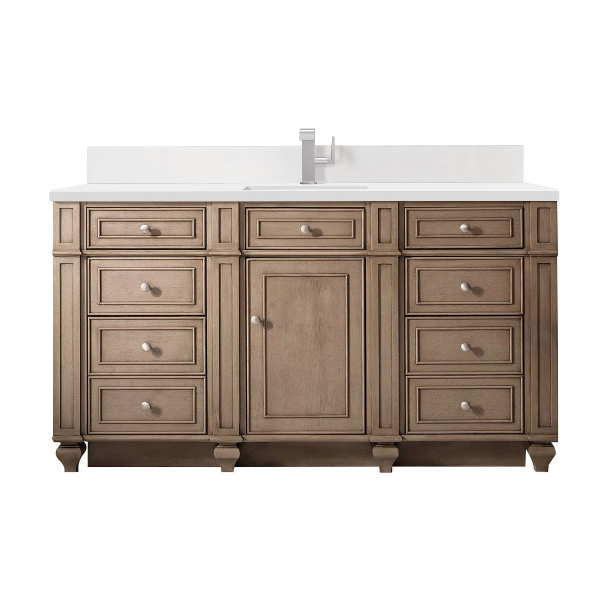 Bristol 60" Single Vanity, Whitewashed Walnut w/ Single Hole 3 CM White Zeus Silestone Top & Backsplash