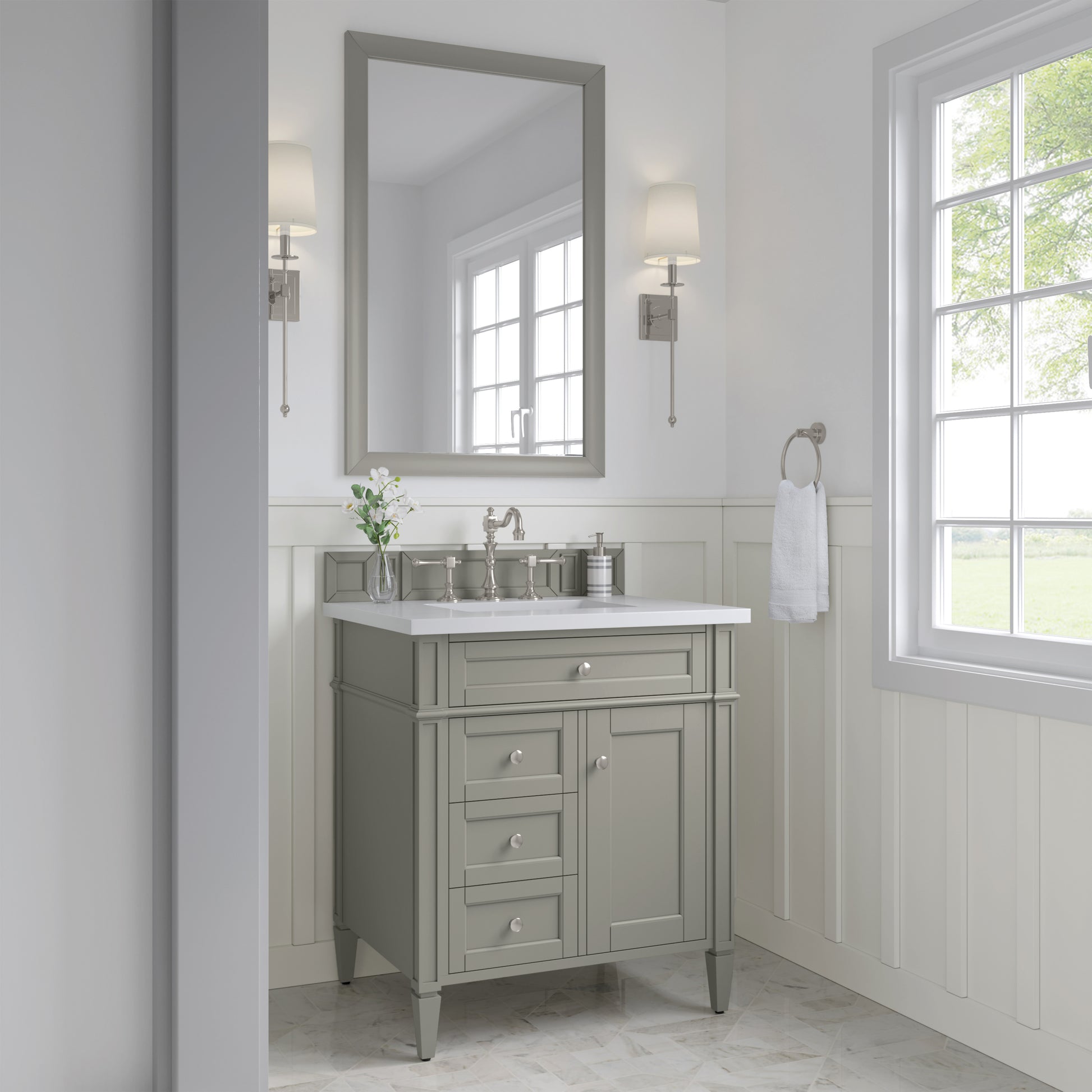 The Brittany 30" Urban Gray Single Vanity by James Martin Vanities features classic details that bridge both traditional and transitional styles. This beautiful piece of furniture includes one hide-away tip-out, top row drawer plus two full-depth side drawers, one of which is double-height for storage of taller items. This cabinet also has one door, which conceals an interior shelf for ample storage, and a bamboo drawer organizer. Handcrafted in yellow poplar solids and veneers with satin nickel hardware. Matching wood backsplash is included. The look is completed with a 3 CM eased edge White Zeus Silestone top by Cosentino and one white ceramic sink.