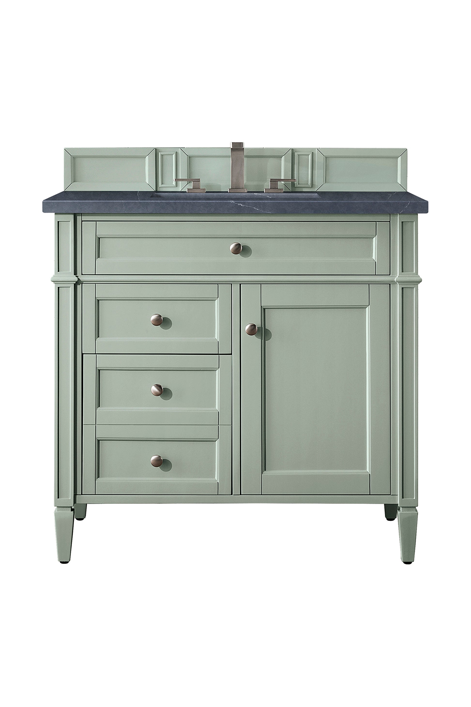 The Brittany 36" Sage Green Single Vanity by James Martin Vanities features classic details that bridge both traditional and transitional styles. This beautiful piece of furniture includes one hide-away tip-out, top row drawer plus two full-depth side drawers, one of which is double-height for storage of taller items. This cabinet also has one door, which conceals an interior shelf for ample storage. Handcrafted in yellow poplar solids and veneers with satin nickel hardware. Matching wood backsplash is included. The look is completed with a 3 CM eased edge Charcoal Soapstone Silestone top by Cosentino and one white ceramic sink.