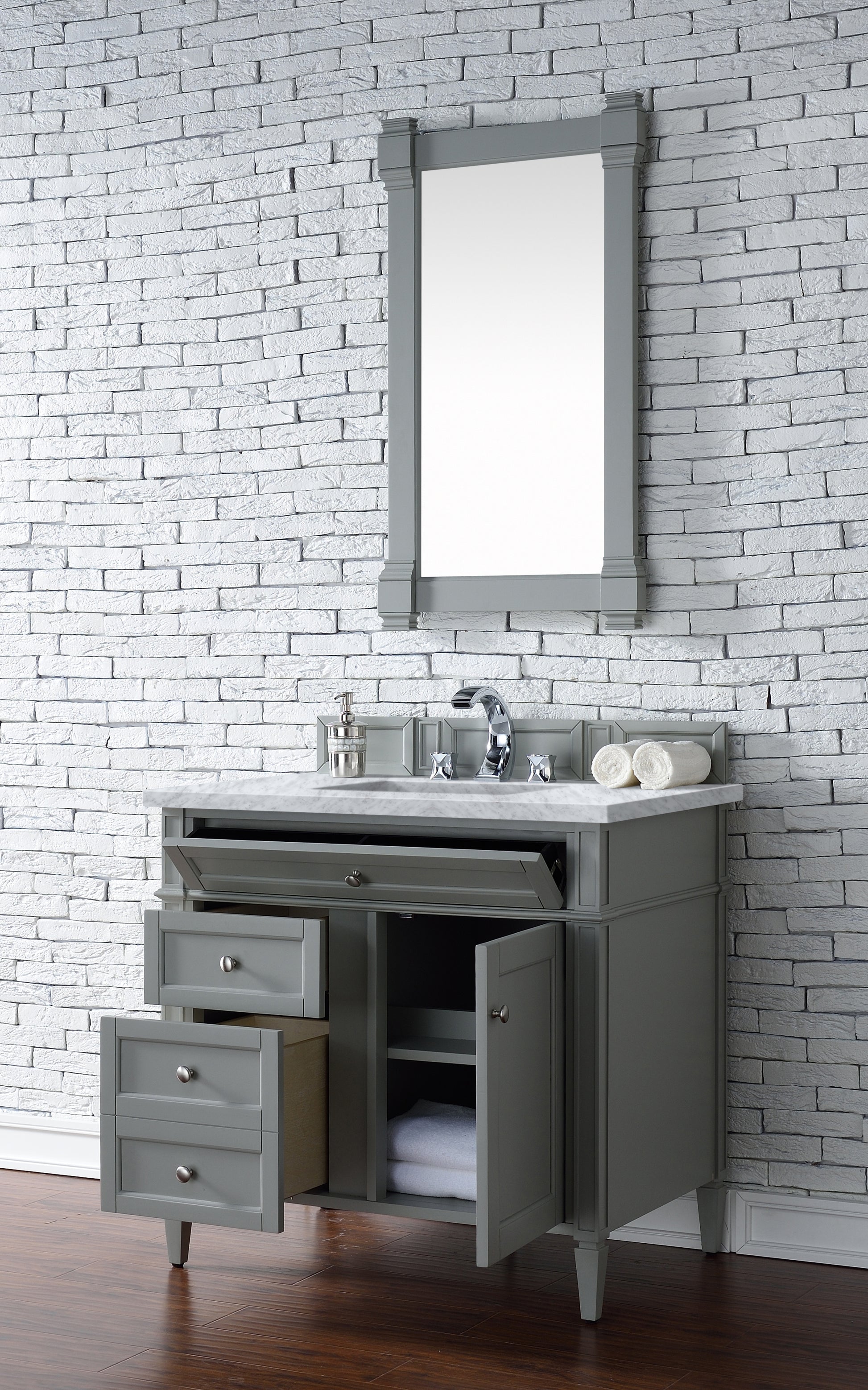 The Brittany 36" Urban Gray Single Vanity by James Martin Vanities features classic details that bridge both traditional and transitional styles. This beautiful piece of furniture includes one hide-away tip-out, top row drawer plus two full-depth side drawers, one of which is double-height for storage of taller items. This cabinet also has one door, which conceals an interior shelf for ample storage. Handcrafted in yellow poplar solids and veneers with satin nickel hardware. Matching wood backsplash is included. The look is completed with a 3 CM eased edge Carrara Marble top and white ceramic rectangular sink.