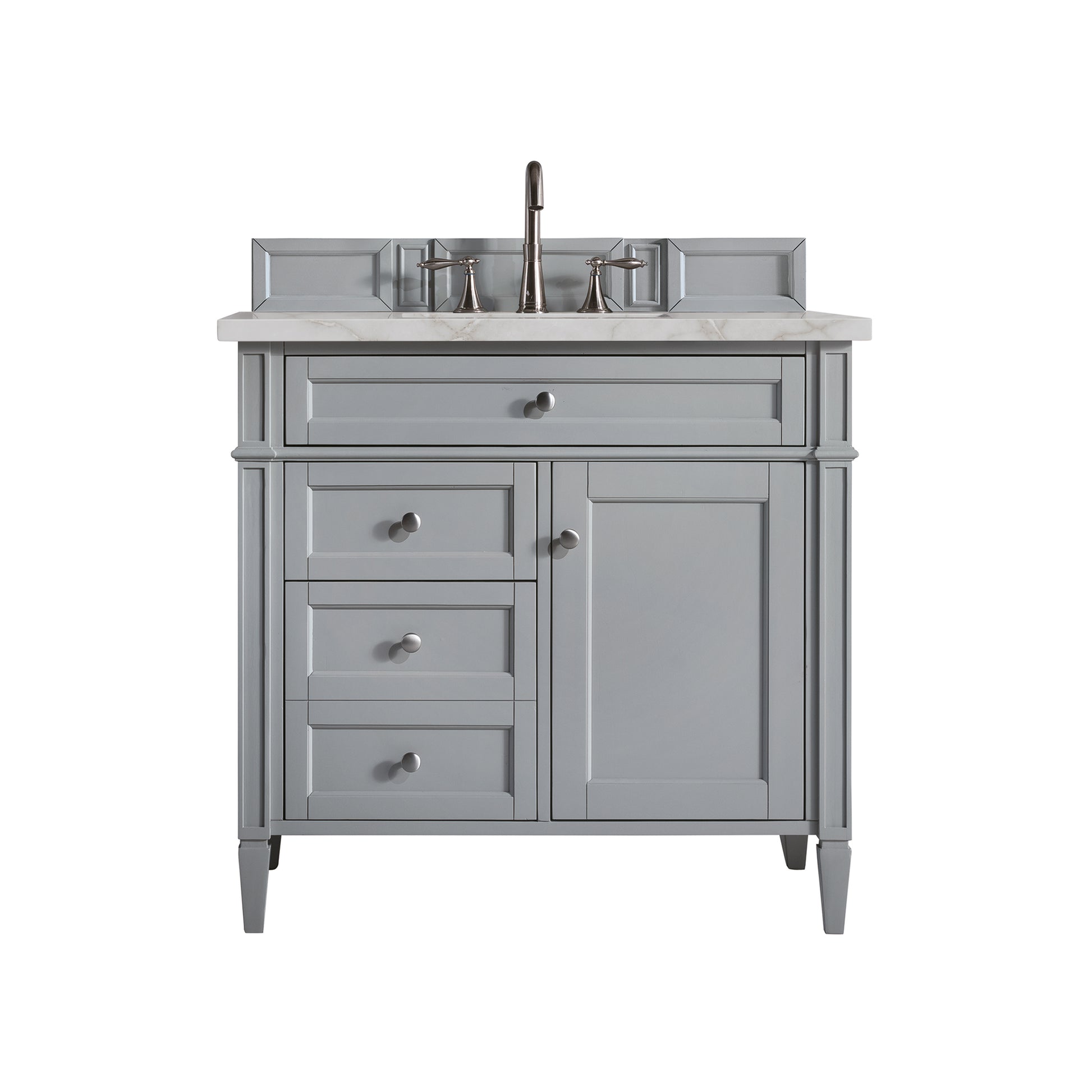 The Brittany 36" Urban Gray Single Vanity by James Martin Vanities features classic details that bridge both traditional and transitional styles. This beautiful piece of furniture includes one hide-away tip-out, top row drawer plus two full-depth side drawers, one of which is double-height for storage of taller items. This cabinet also has one door, which conceals an interior shelf for ample storage. Handcrafted in yellow Poplar solids and veneers with satin nickel hardware. Matching wood backsplash is included. The look is completed with a 3 CM eased-edge countertop by Cosentino in Victorian Silver, which features a cool background tone with silver and dark neutral veins, complimented with champagne metallic accents. It includes pre-drilled holes for an 8-inch widespread faucet (not included), one white porcelain rectangular sink, as well as the appropriate mounting brackets for installation.