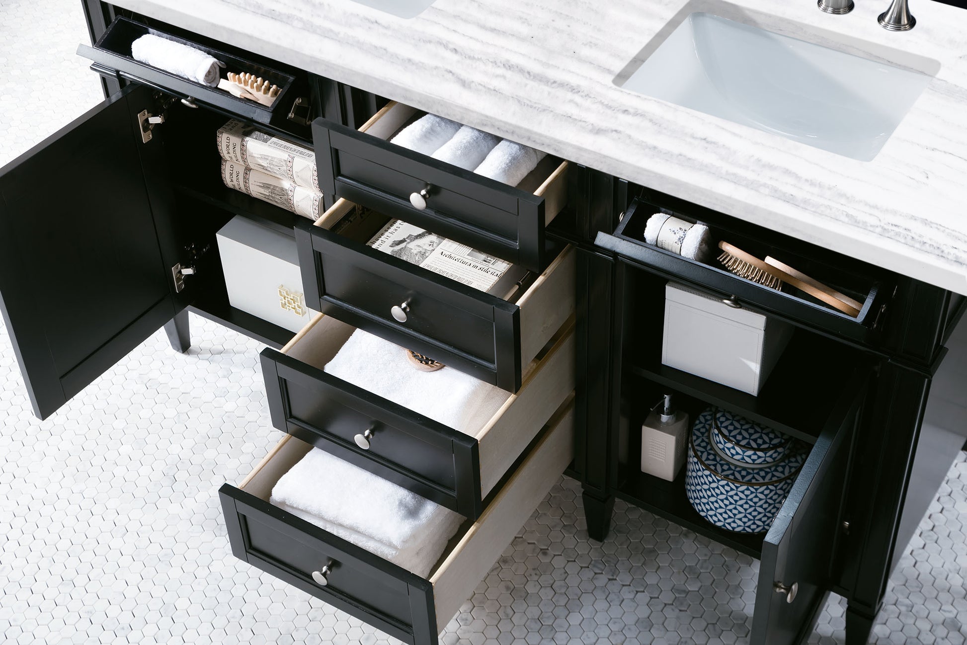 The Brittany 60" Black Onyx Double Vanity by James Martin Vanities features classic details that bridge both traditional and transitional styles. This beautiful piece of furniture includes two hide-away tip-out, top row drawers and four full-depth drawers. This cabinet also has two doors, which conceal an interior shelf for ample storage. Handcrafted in yellow poplar solids and veneers with satin nickel hardware. Matching wood backsplash is included. The look is completed with a 3 CM eased edge 3 CM eased edge Arctic Fall Solid Surface top with two white ceramic rectangular sinks.