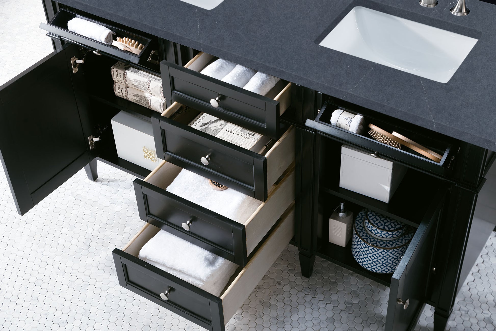 The Brittany 60" Black Onyx Double Vanity by James Martin Vanities features classic details that bridge both traditional and transitional styles. This beautiful piece of furniture includes two hide-away tip-out, top row drawers and four full-depth drawers. This cabinet also has two doors, which conceal an interior shelf for ample storage. Handcrafted in yellow poplar solids and veneers with satin nickel hardware. Matching wood backsplash is included. The look is completed with a 3 CM eased edge 3 CM eased edge Charcoal Soapstone Silestone top with two white ceramic rectangular sinks.