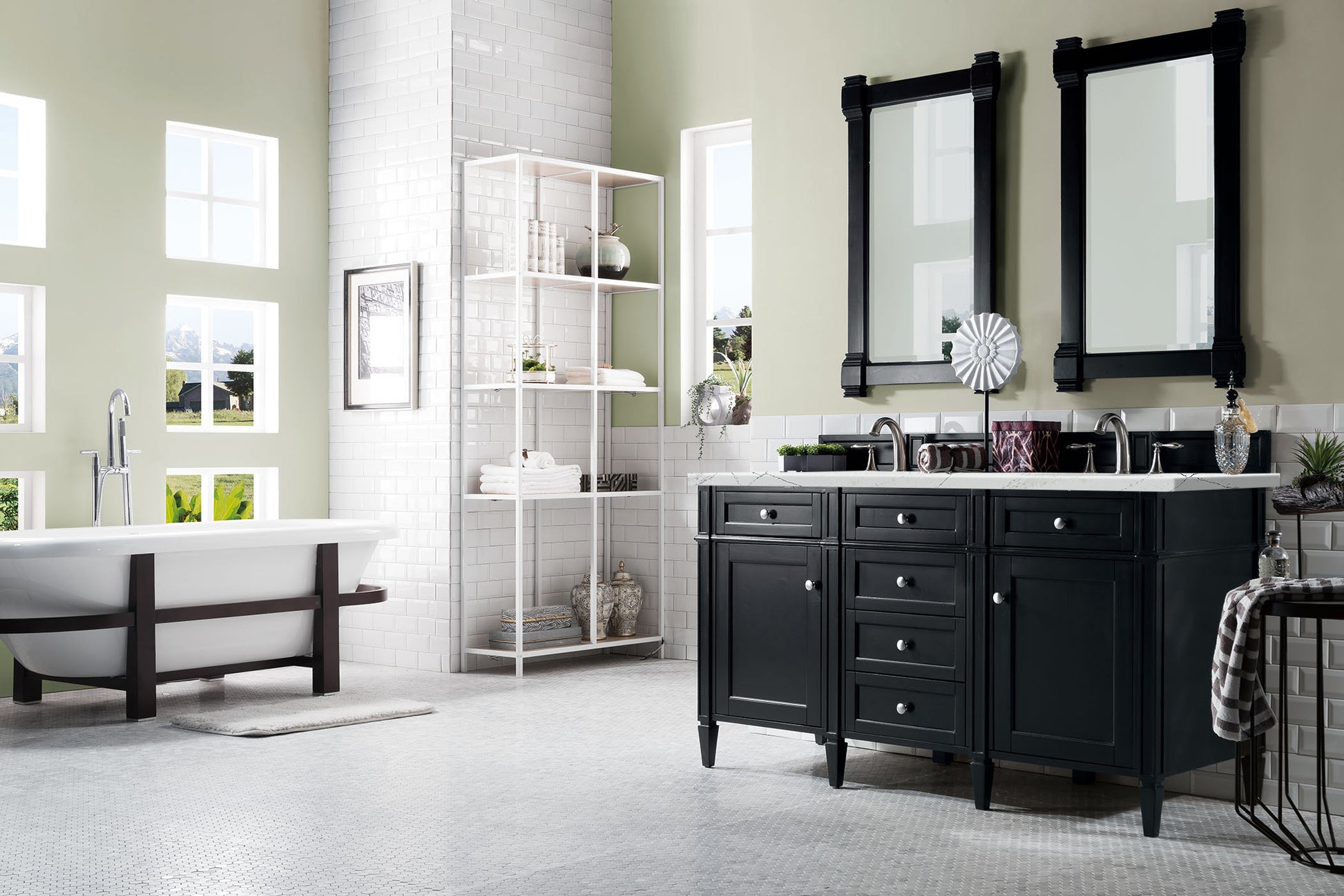 The Brittany 60" Black Onyx Double Vanity by James Martin Vanities features classic details that bridge both traditional and transitional styles. This beautiful piece of furniture includes two hide-away tip-out, top row drawers and four full-depth drawers. This cabinet also has two doors, which conceal an interior shelf for ample storage. Handcrafted in yellow poplar solids and veneers with satin nickel hardware. Matching wood backsplash is included. The look is completed with a 3 CM eased edge 3 CM eased edge Ethereal Noctis top with two white ceramic rectangular sinks.