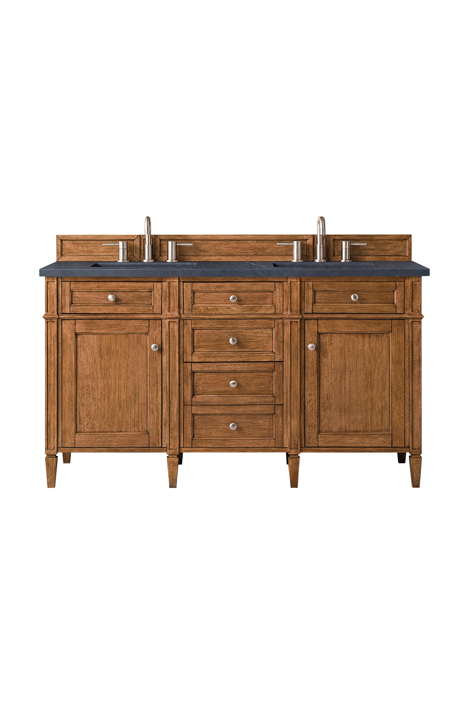 The Brittany 60" Saddle Brown Double Vanity by James Martin Vanities features classic details that bridge both traditional and transitional styles. This beautiful piece of furniture includes two hide-away tip-out, top row drawers and four full-depth drawers. This cabinet also has two doors, which conceal an interior shelf for ample storage. Handcrafted in yellow poplar solids and veneers with satin nickel hardware. Matching wood backsplash is included. The look is completed with a 3 CM eased edge 3 CM eased edge Charcoal Soapstone Silestone top with two white ceramic rectangular sinks.