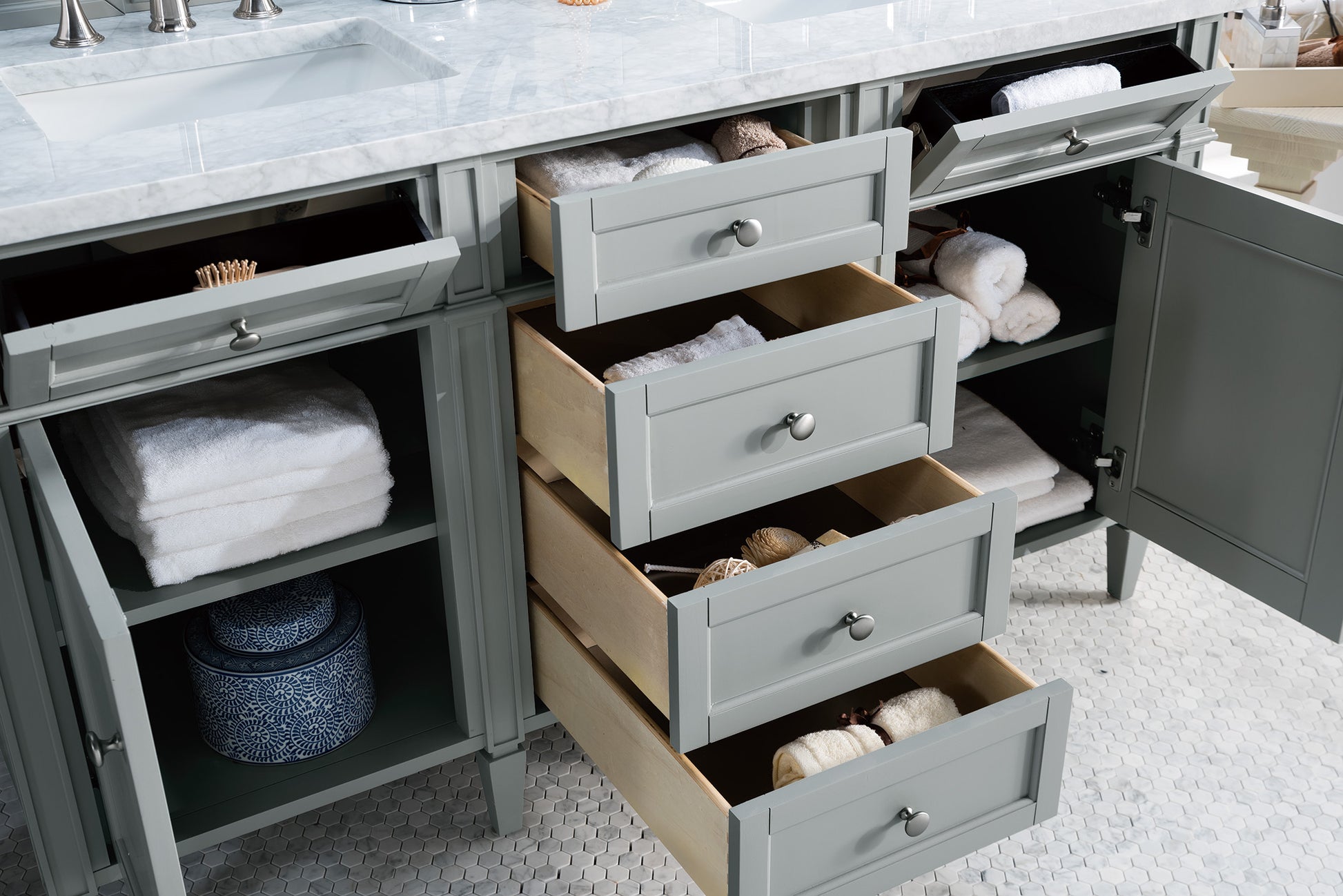 The Brittany 60" Urban Gray Double Vanity by James Martin Vanities features classic details that bridge both traditional and transitional styles. This beautiful piece of furniture includes two hide-away tip-out, top row drawers and four full-depth drawers. This cabinet also has two doors, which conceal an interior shelf for ample storage. Handcrafted in yellow poplar solids and veneers with satin nickel hardware. Matching wood backsplash is included. The look is completed with a 3 CM eased edge 3 CM eased edge Carrara Marble top with two white ceramic rectangular sinks.