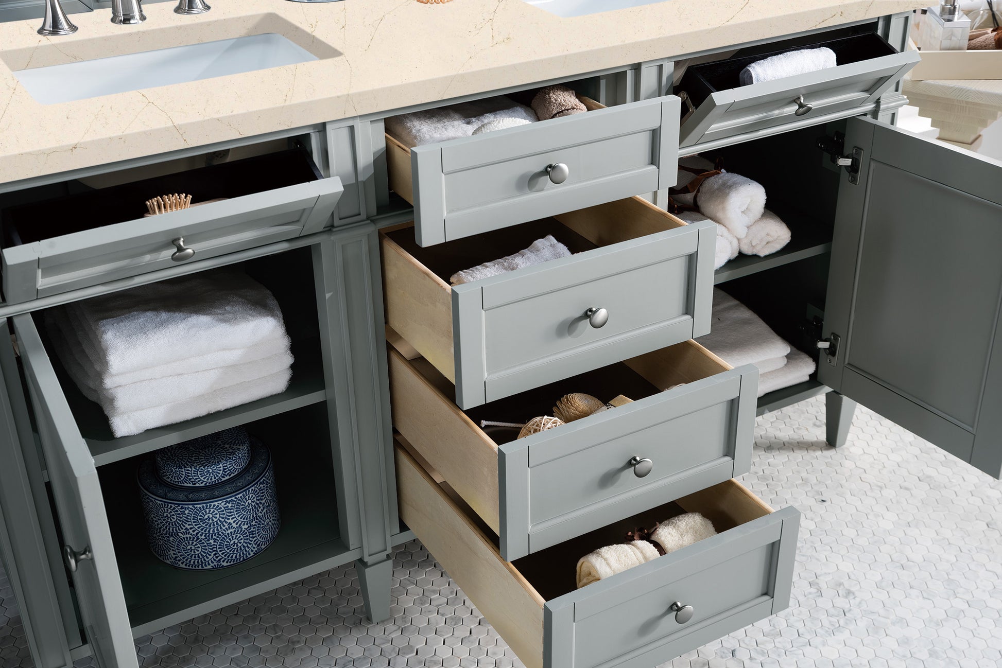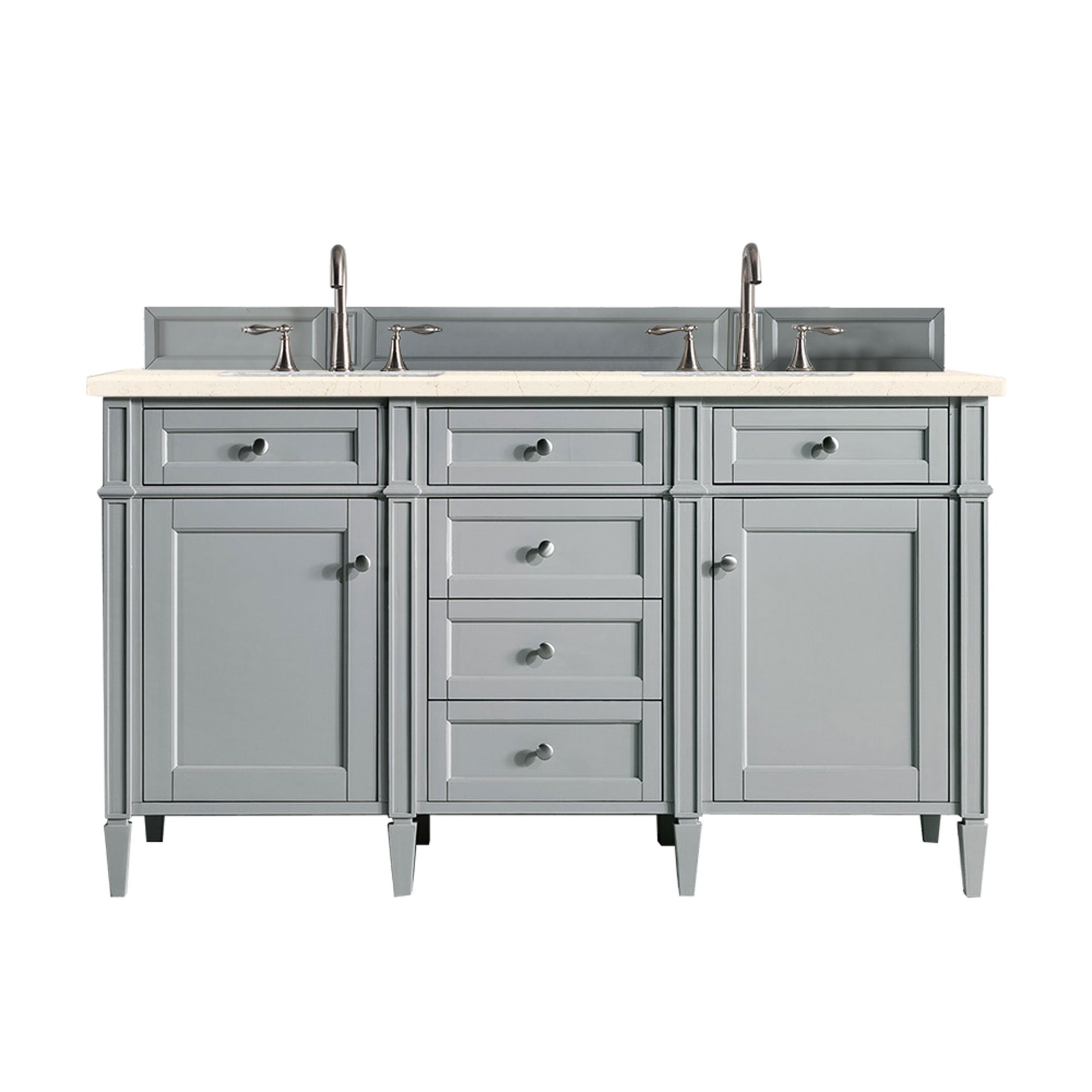 The Brittany 60" Urban Gray Double Vanity by James Martin Vanities features classic details that bridge both traditional and transitional styles. This beautiful piece of furniture includes two hide-away tip-out, top row drawers and four full-depth drawers. This cabinet also has two doors, which conceal an interior shelf for ample storage. Handcrafted in yellow poplar solids and veneers with satin nickel hardware. Matching wood backsplash is included. The look is completed with a 3 CM eased edge 3 CM eased edge Eternal Marfil Silestone top with two white ceramic rectangular sinks.