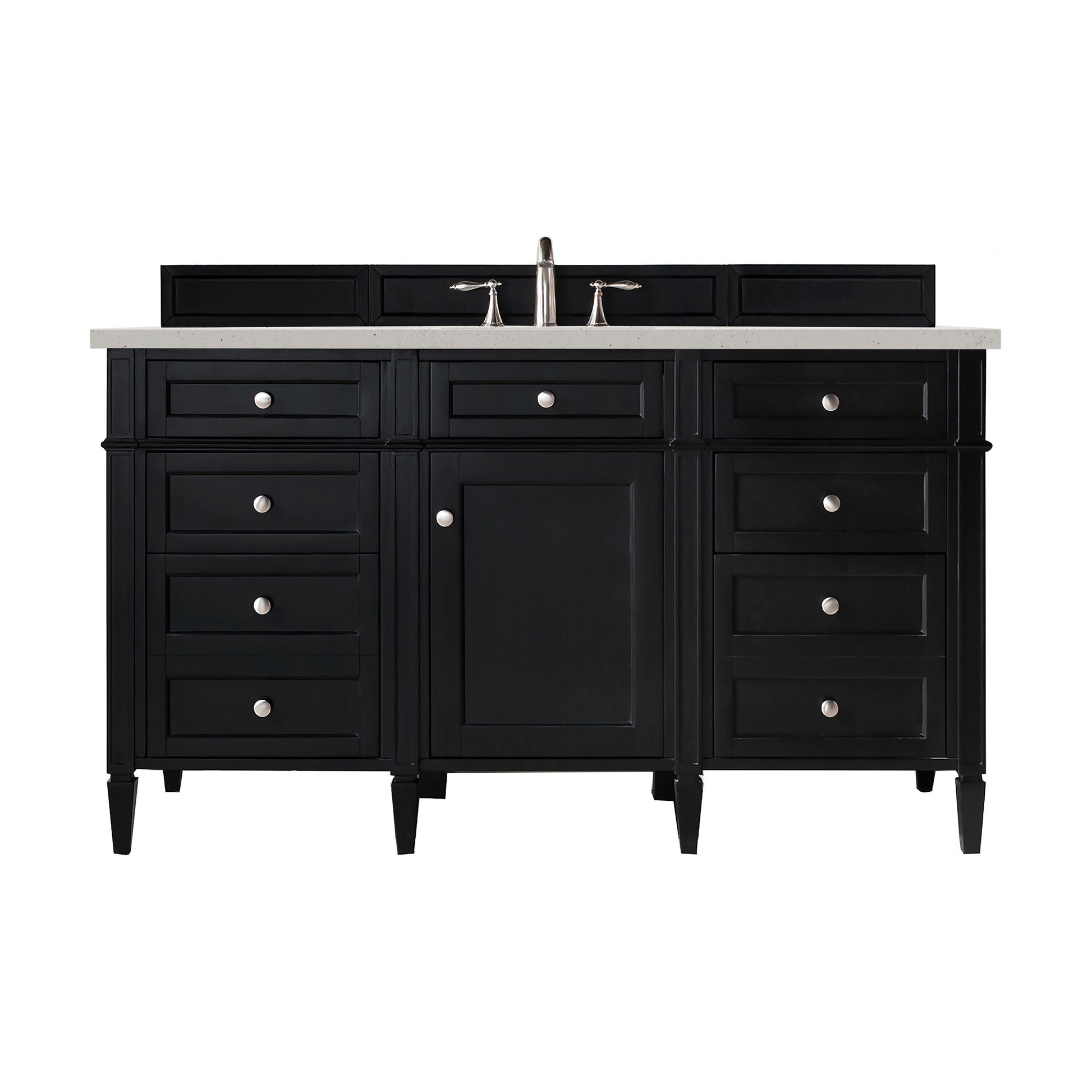The Brittany 60" Black Onyx Single Vanity by James Martin Vanities features classic details that bridge both traditional and transitional styles. This beautiful piece of furniture includes one hide-away top row tip-out drawer, plus six full-depth drawers, two of which are double-height for storage of taller items. This cabinet also has one door, which conceals an interior shelf for ample storage. Handcrafted in yellow Poplar solids and veneers with satin nickel hardware. Matching wood backsplash is included. The look is completed with a 3 CM eased-edge countertop by Cosentino in Lime Delight, which brings a warm, textured beige tones in a suede finish. It includes pre-drilled holes for an 8-inch widespread faucet (not included), one white porcelain rectangular sink, as well as the appropriate mounting brackets for installation.