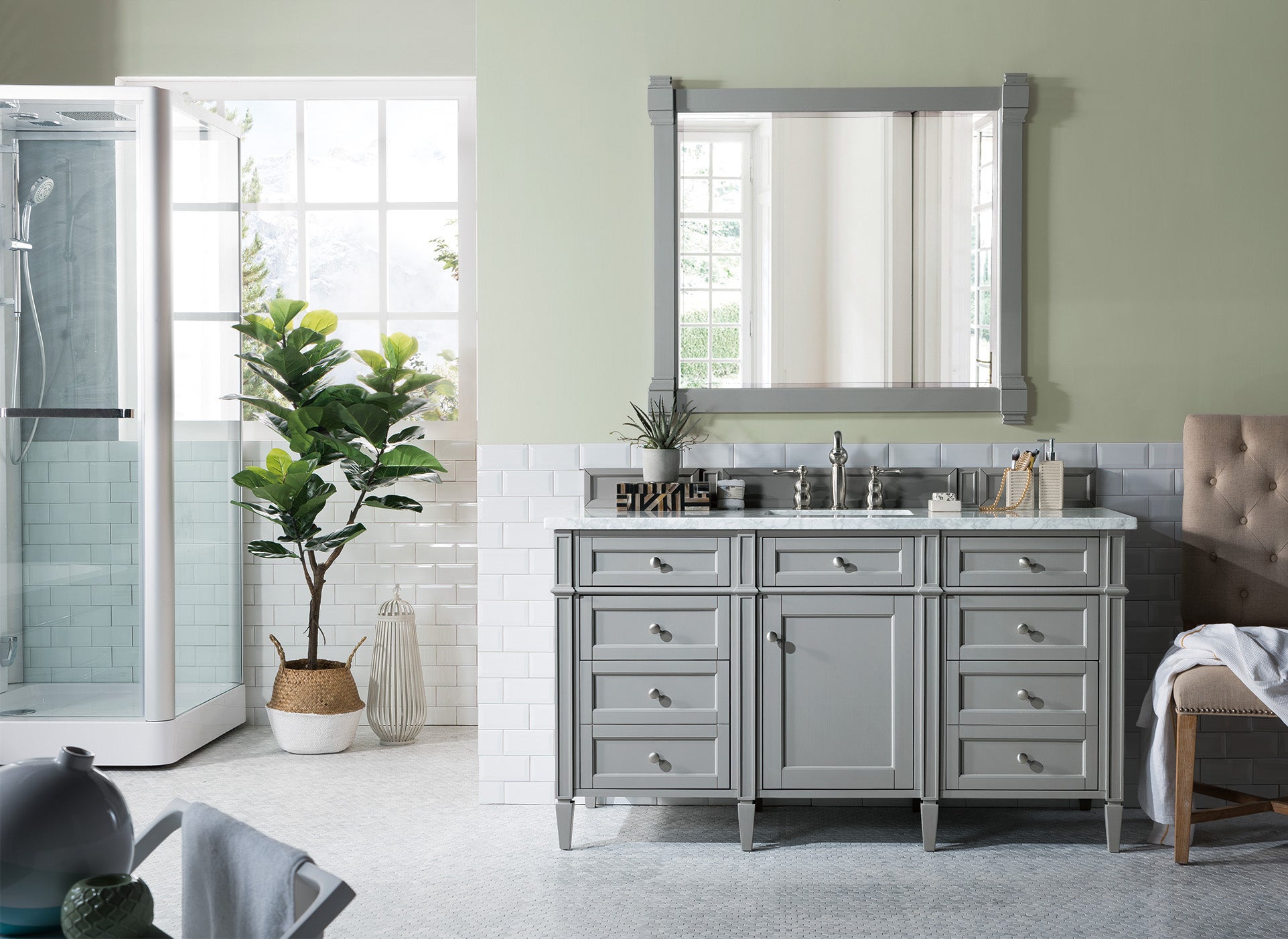 The Brittany 60" Urban Gray Single Vanity by James Martin Vanities features classic details that bridge both traditional and transitional styles. This beautiful piece of furniture includes one hide-away top row tip-out drawer, plus six full-depth drawers, two of which are double-height for storage of taller items. This cabinet also has one door, which conceals an interior shelf for ample storage. Handcrafted in yellow poplar solids and veneers with satin nickel hardware. Matching wood backsplash is included. The look is completed with a 3 CM eased edge Carrara Marble top and white ceramic rectangular sink.