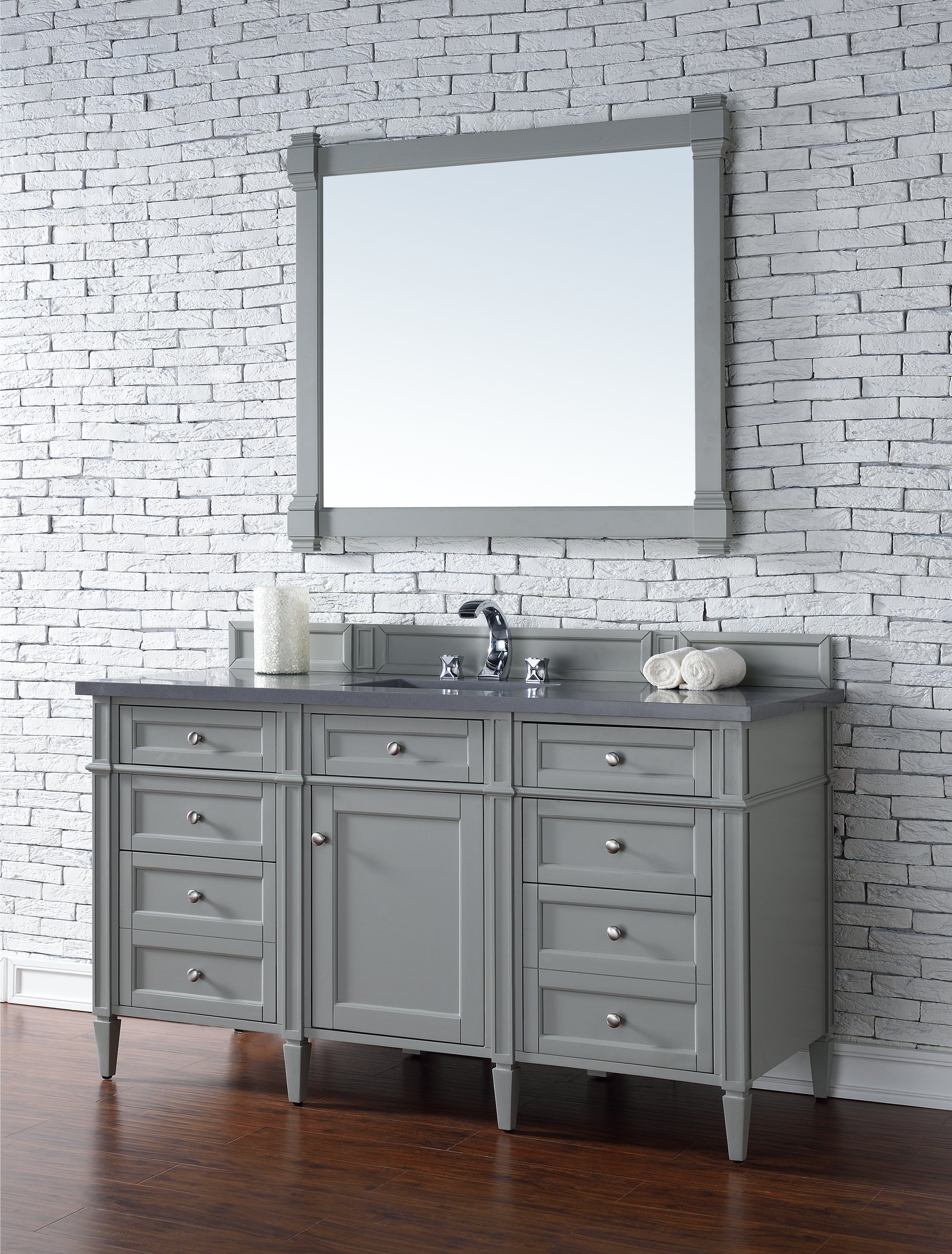 The Brittany 60" Urban Gray Single Vanity by James Martin Vanities features classic details that bridge both traditional and transitional styles. This beautiful piece of furniture includes one hide-away top row tip-out drawer, plus six full-depth drawers, two of which are double-height for storage of taller items. This cabinet also has one door, which conceals an interior shelf for ample storage. Handcrafted in yellow poplar solids and veneers with satin nickel hardware. Matching wood backsplash is included. The look is completed with a 3 CM eased edge Charcoal Soapstone Silestone top by Cosentino and one white ceramic sink.
