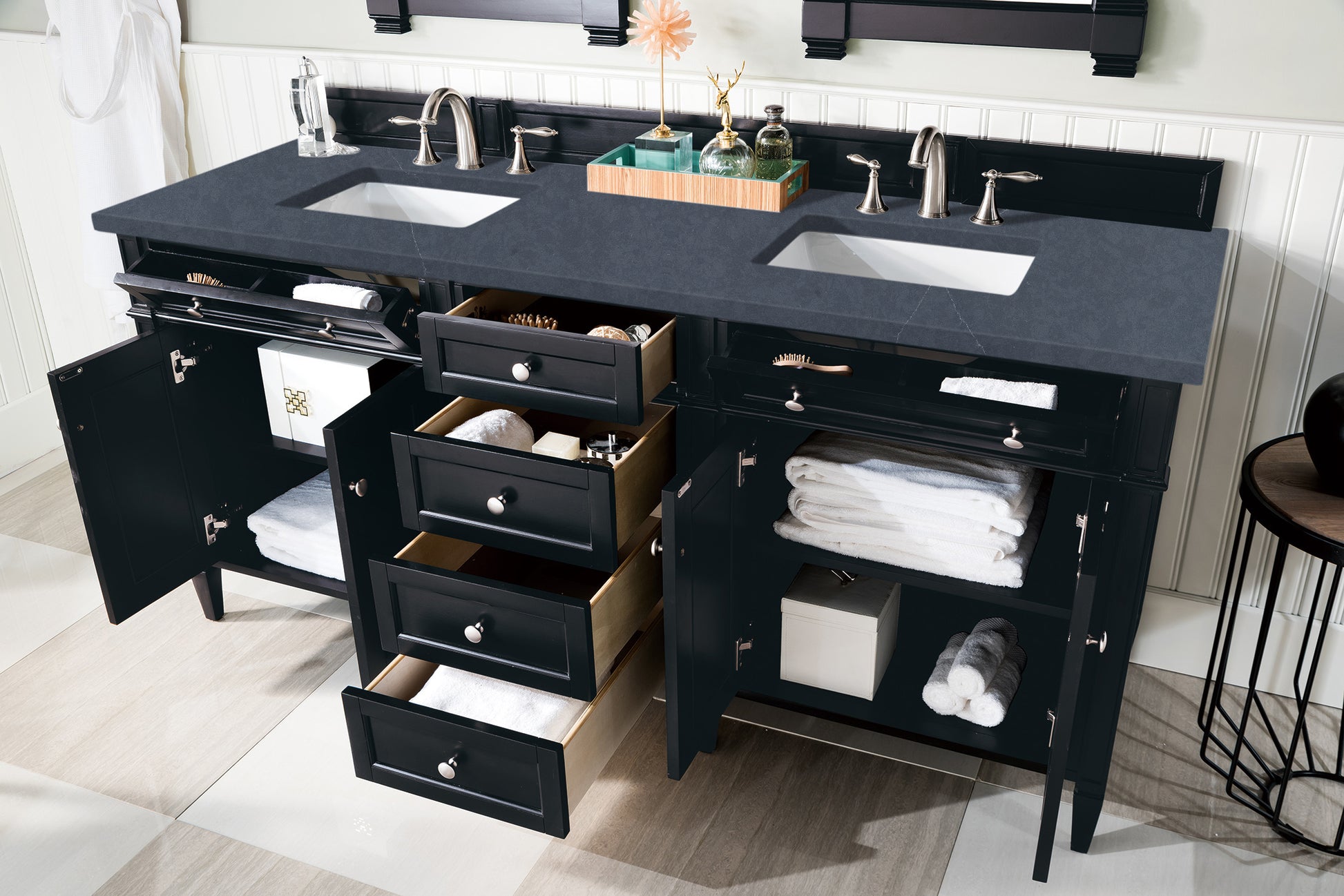 The Brittany 72" Black Onyx Double Vanity by James Martin Vanities features classic details that bridge both traditional and transitional styles. This beautiful piece of furniture includes two hide-away tip-out, top row drawers and four full-depth drawers. This cabinet also has four doors which conceal interior shelves for ample storage. Handcrafted in yellow poplar solids and veneers with satin nickel hardware. Matching wood backsplash is included. The look is completed with a 3 CM eased edge 3 CM eased edge Charcoal Soapstone Silestone top with two white ceramic rectangular sinks.