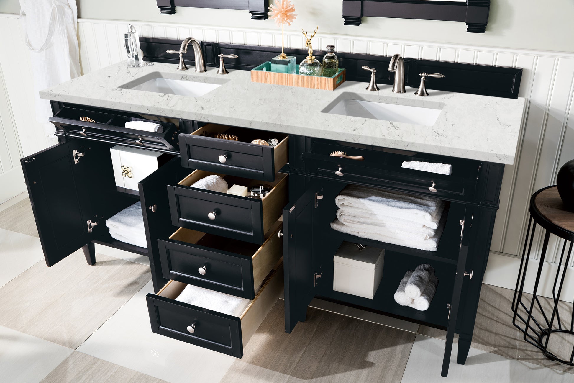 The Brittany 72" Black Onyx Double Vanity by James Martin Vanities features classic details that bridge both traditional and transitional styles. This beautiful piece of furniture includes two hide-away tip-out, top row drawers and four full-depth drawers. This cabinet also has four doors which conceal interior shelves for ample storage. Handcrafted in yellow poplar solids and veneers with satin nickel hardware. Matching wood backsplash is included. The look is completed with a 3 CM eased edge 3 CM eased edge Eternal Jasmine Pearl Silestone top with two white ceramic rectangular sinks.