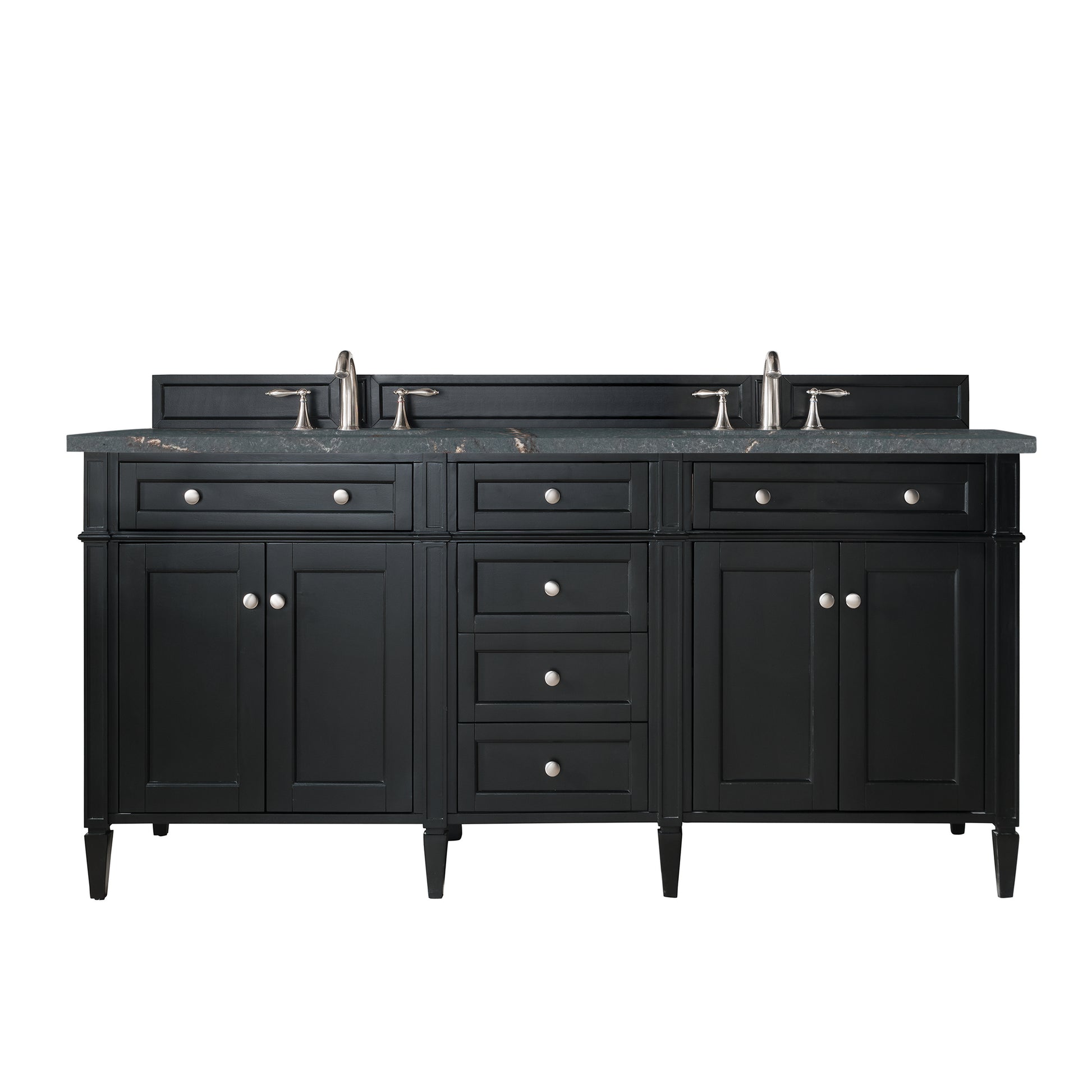 The Brittany 72" Black Onyx Double Vanity by James Martin Vanities features classic details that bridge both traditional and transitional styles. This beautiful piece of furniture includes two hide-away tip-out, top row drawers and four full-depth drawers. This cabinet also has four doors which conceal interior shelves for ample storage. Handcrafted in yellow Poplar solids and veneers with satin nickel hardware. Matching wood backsplash is included. The look is completed with a 3 CM eased-edge countertop by Cosentino in Parisien Bleu, featuring intricate neutral veining and striking coppery accents coursing through deep blue hues. It includes pre-drilled holes for two 8-inch widespread faucets (not included), two white porcelain rectangular sinks, as well as the appropriate mounting brackets for installation.