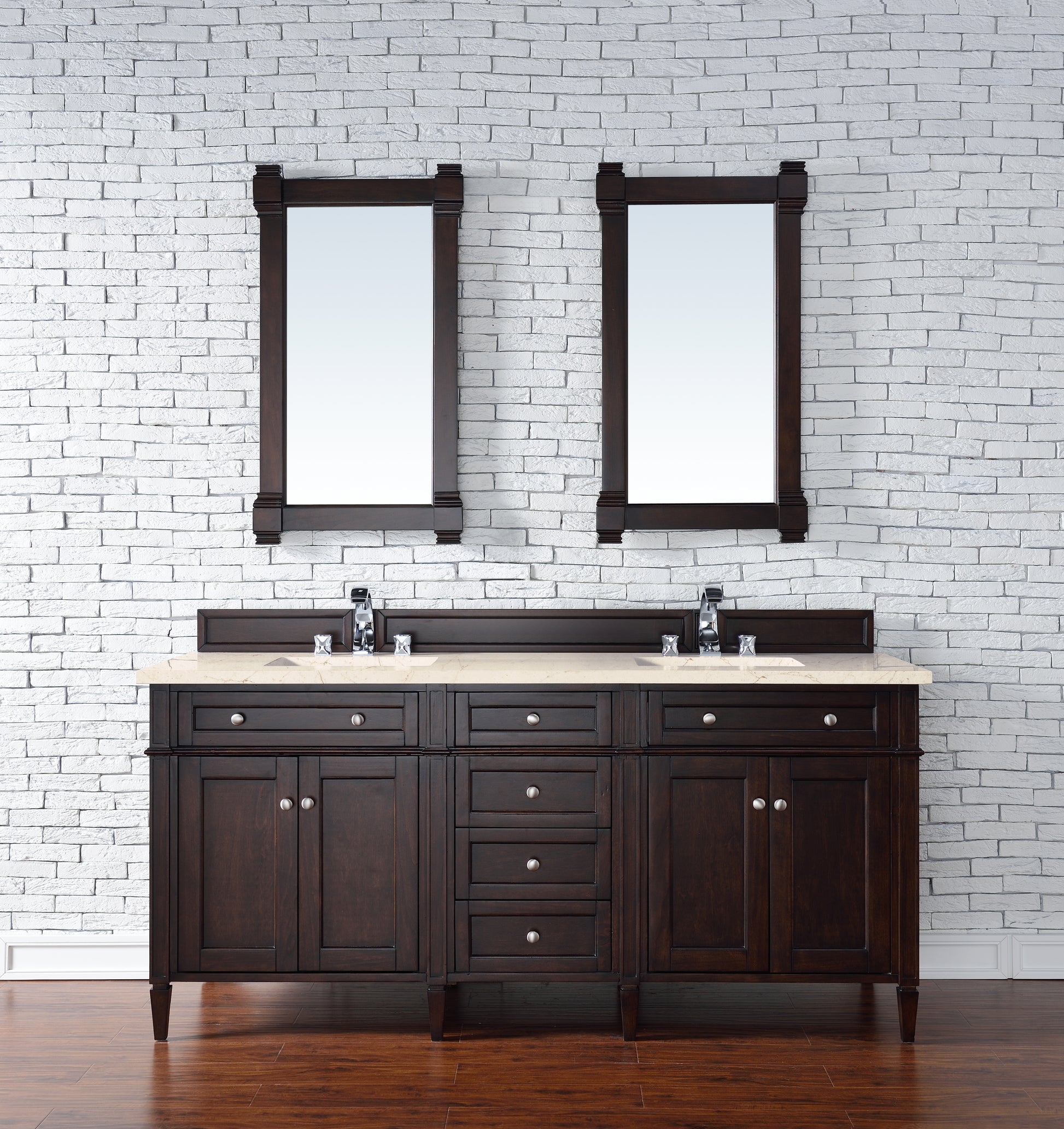 The Brittany 72" Burnished Mahogany Double Vanity by James Martin Vanities features classic details that bridge both traditional and transitional styles. This beautiful piece of furniture includes two hide-away tip-out, top row drawers and four full-depth drawers. This cabinet also has four doors which conceal interior shelves for ample storage. Handcrafted in yellow poplar solids and veneers with satin nickel hardware. Matching wood backsplash is included. The look is completed with a 3 CM eased edge 3 CM eased edge Eternal Marfil Silestone top with two white ceramic rectangular sinks.