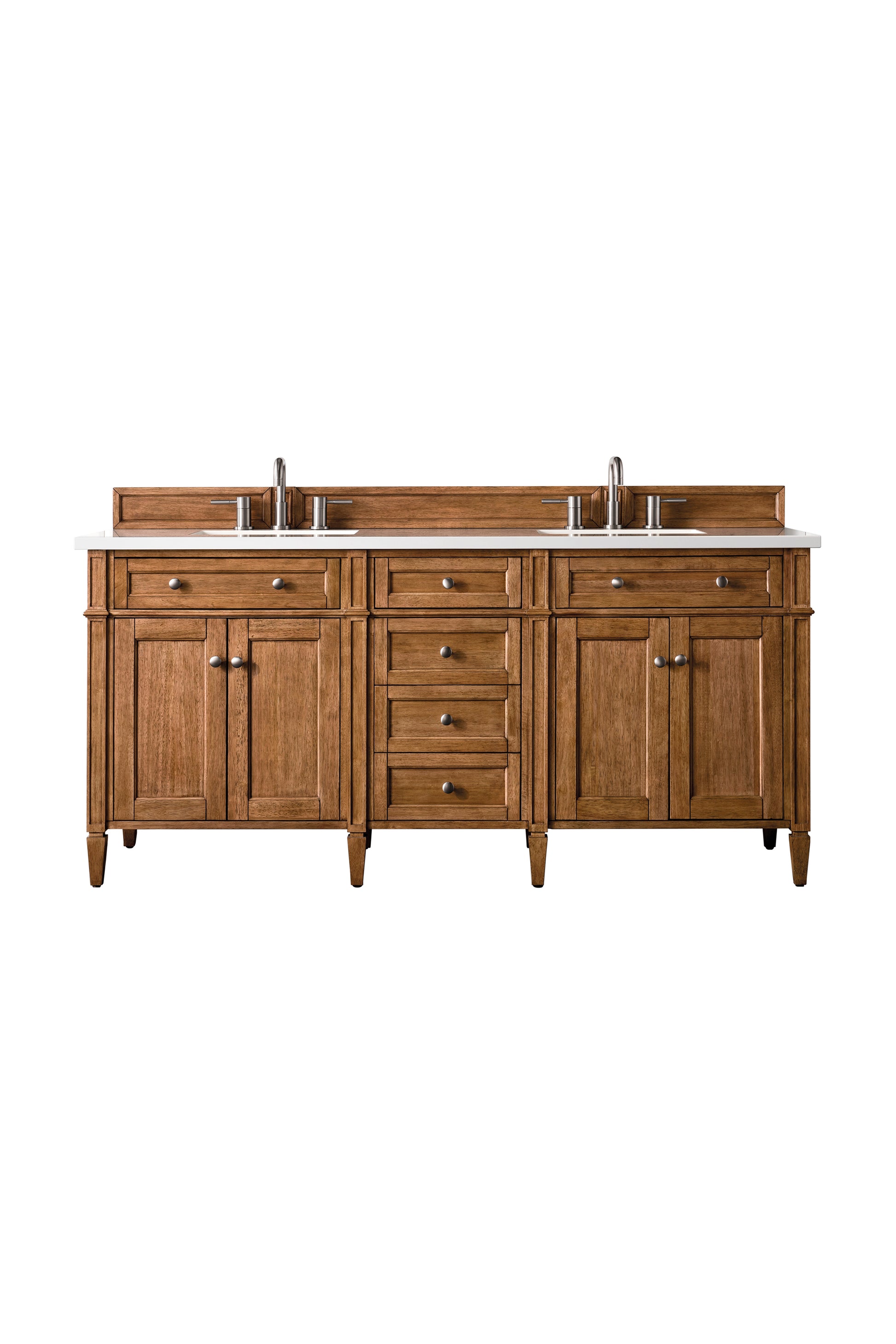 The Brittany 72" Saddle Brown Double Vanity by James Martin Vanities features classic details that bridge both traditional and transitional styles. This beautiful piece of furniture includes two hide-away tip-out, top row drawers and four full-depth drawers. This cabinet also has four doors which conceal interior shelves for ample storage. Handcrafted in yellow poplar solids and veneers with satin nickel hardware. Matching wood backsplash is included. The look is completed with a 3 CM eased edge 3 CM eased edge White Zeus Silestone top with two white ceramic rectangular sinks.