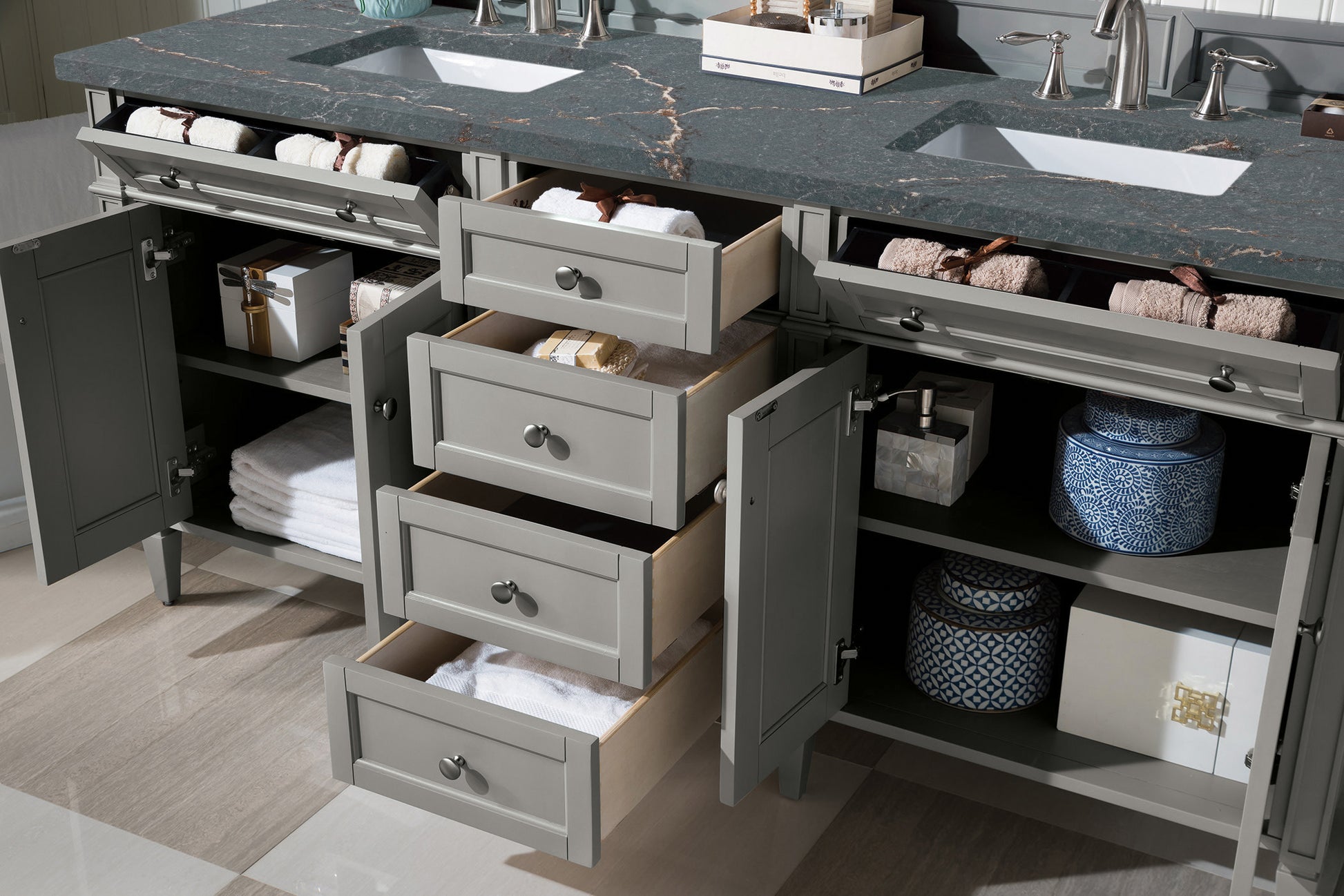 The Brittany 72" Urban Gray Double Vanity by James Martin Vanities features classic details that bridge both traditional and transitional styles. This beautiful piece of furniture includes two hide-away tip-out, top row drawers and four full-depth drawers. This cabinet also has four doors which conceal interior shelves for ample storage. Handcrafted in yellow Poplar solids and veneers with satin nickel hardware. Matching wood backsplash is included. The look is completed with a 3 CM eased-edge countertop by Cosentino in Parisien Bleu, featuring intricate neutral veining and striking coppery accents coursing through deep blue hues. It includes pre-drilled holes for two 8-inch widespread faucets (not included), two white porcelain rectangular sinks, as well as the appropriate mounting brackets for installation.