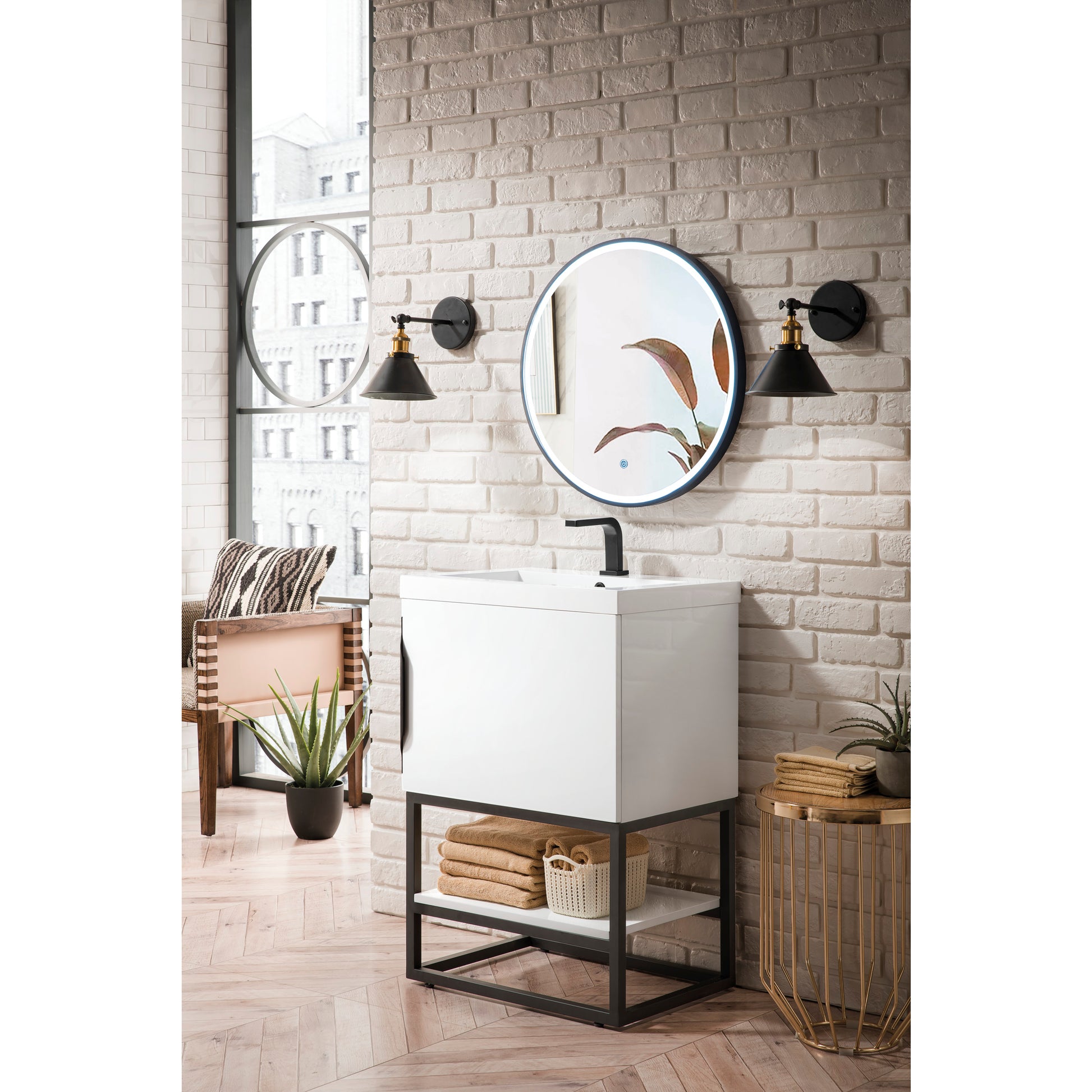 Add a fresh, contemporary touch to your bathroom with the elegant 24" Columbia Single Vanity by James Martin Vanities. Includes one soft-closing cabinet door in a lovely Glossy White finish, this stylish bathroom cabinet features clean lines and a simple metal base with tons of storage in a Matte Black finish. The door opens to an under-sink storage space with one adjustable shelf that will allow you to store your bathroom essentials. The beautiful Matte Black hardware is included, giving this cabinet the perfect finishing touch. The cabinet is finished inside and out with a premium finish for superior moisture and UV resistance. This versatile cabinet includes an integrated White Glossy Composite Stone top that is pre-drilled for your convenience.