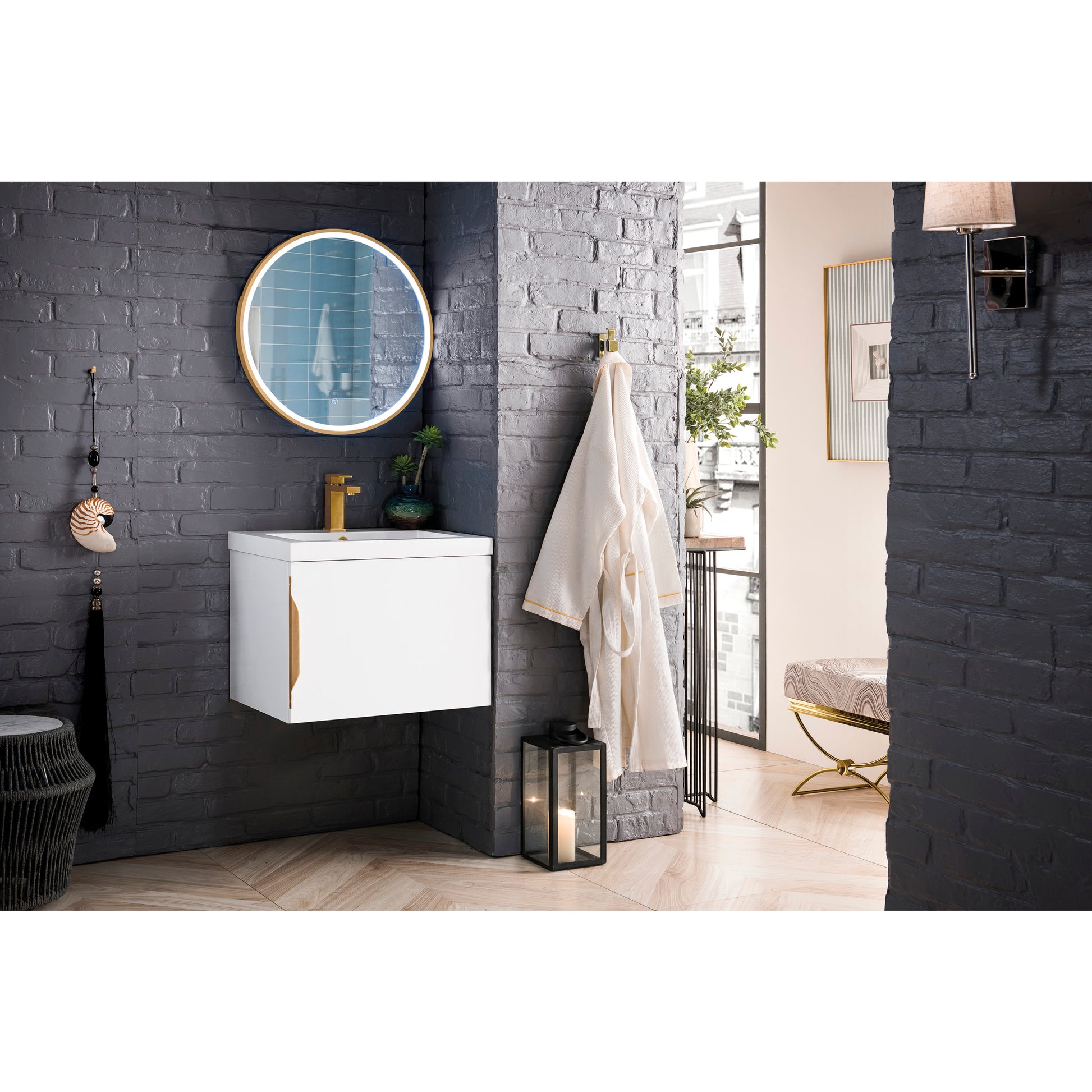 Add a fresh, contemporary touch to your bathroom with the elegant 24" Columbia Single Vanity by James Martin Vanities. Includes one soft-closing cabinet door in a lovely crispy, clean Glossy White look. The door opens to an under-sink storage space with one adjustable shelf that will allow you to store your bathroom essentials. The beautiful stainless steel hardware is included, giving this cabinet the perfect finishing touch. The cabinet is finished inside and out with a premium finish for superior moisture and UV resistance. This versatile cabinet includes an integrated White Glossy Composite Stone top that is pre-drilled for your convenience.