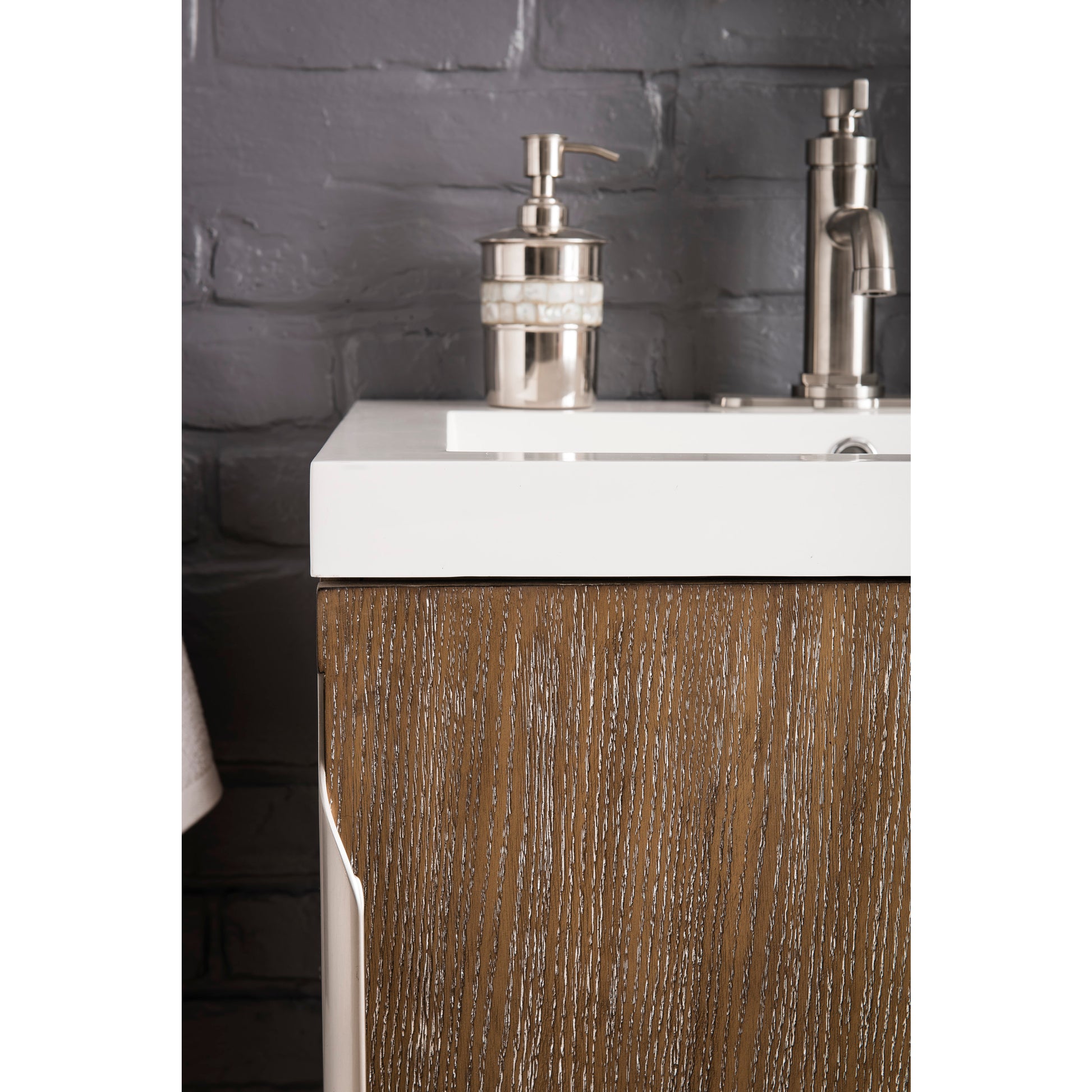Add a fresh, contemporary touch to your bathroom with the elegant 24" Columbia Single Vanity by James Martin Vanities. Includes one soft-closing cabinet door in a lovely Latte Oak, this stylish bathroom cabinet features clean lines and a simple metal base with tons of storage in a Brushed Nickel finish. The door opens to an under-sink storage space with one adjustable shelf that will allow you to store your bathroom essentials. The beautiful Brushed Nickel hardware is included, giving this cabinet the perfect finishing touch. The cabinet is finished inside and out with a premium finish for superior moisture and UV resistance. This versatile cabinet includes a White Glossy Composite Stone top that shows off its elegant style with a rectangle basin of white composite stone.