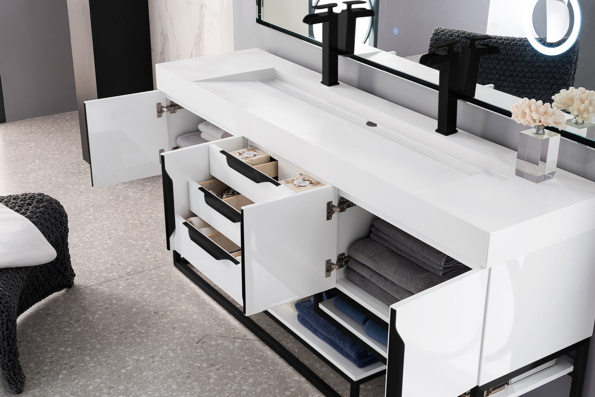 The Columbia 72" Glossy White Double Vanity offers maximum storage with two soft-closing doors, three soft-closing drawers, and lower shelf space. This cabinet includes premium features such as one solid bamboo drawer organizer and one 120 Volt UL Rated electrical component with two electrical and two USB outlets. The Matte Black finished base coordinates with the pulls. Glossy White Composite Stone countertop with integrated wide, angled trough-style sink.