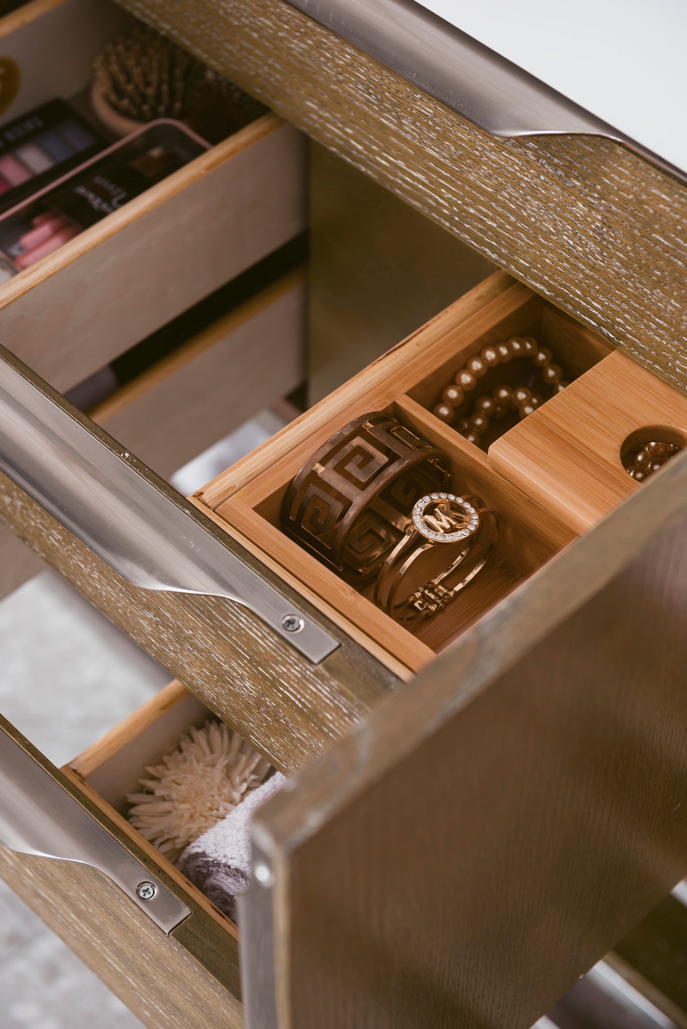 • Drawer bottoms are lined with our signature brushed aluminum laminate.
