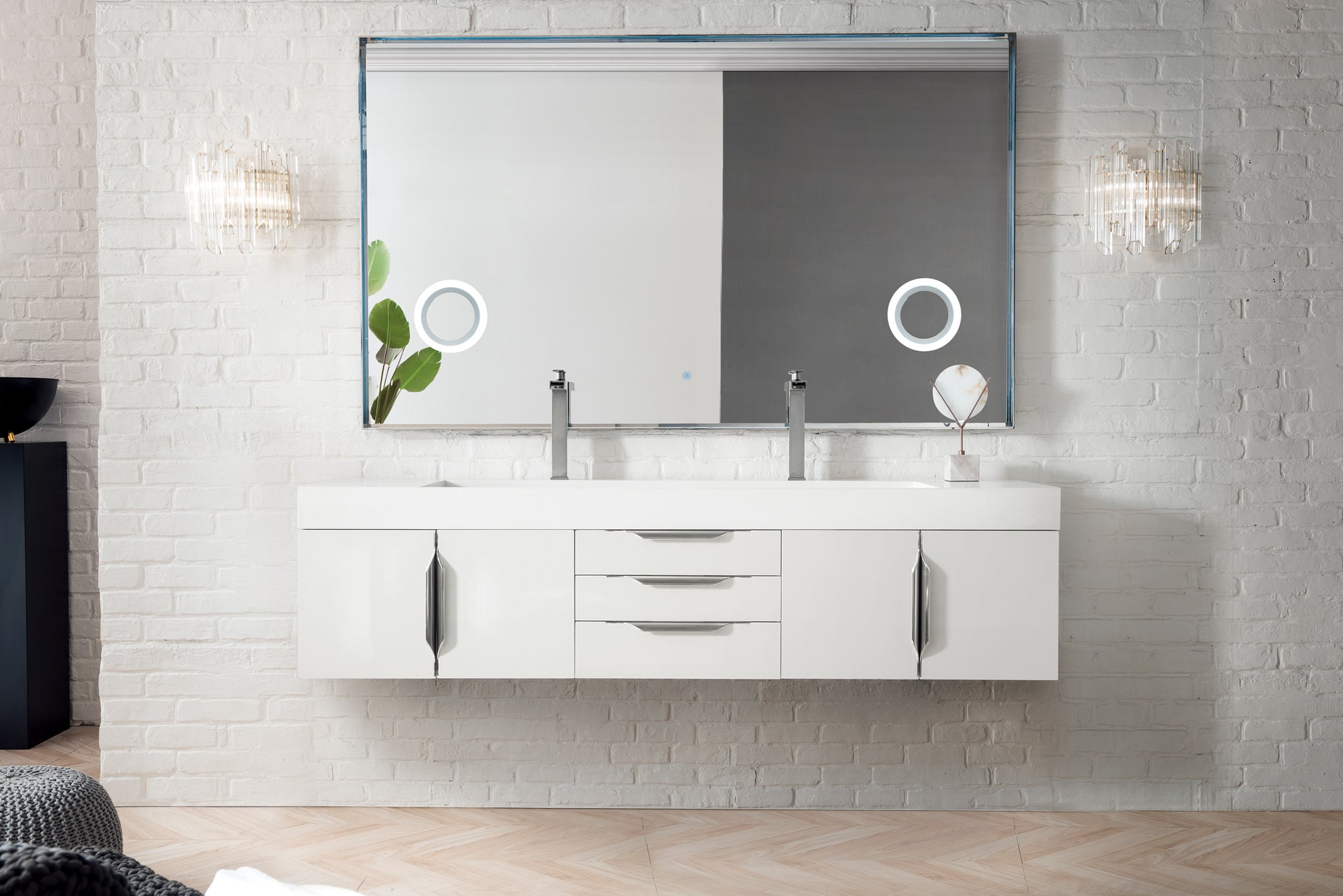 Columbia 72" Double Wall Mount Vanity, Glossy White, Brushed Nickel w/ Glossy White Composite Stone Top