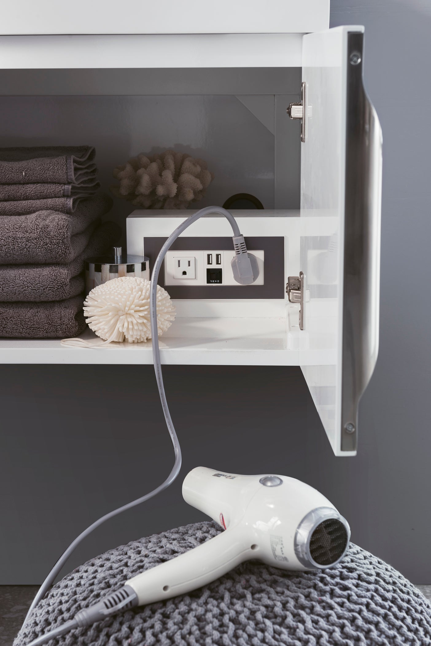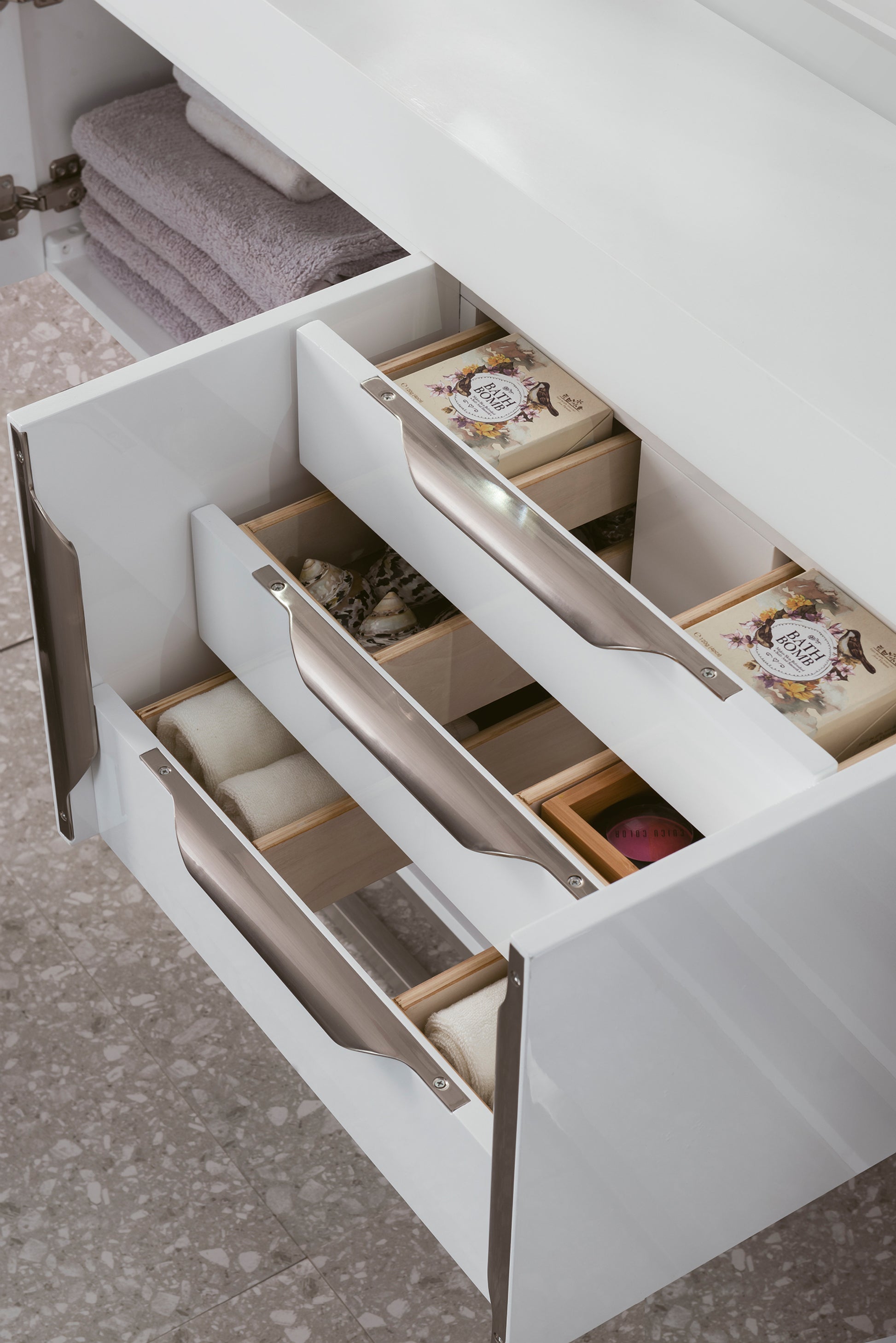 The Columbia 72" Glossy White Double Vanity offers maximum storage with four soft-closing doors and three soft-closing drawers. This cabinet includes premium features such as one solid bamboo drawer organizer and one 120 Volt UL Rated electrical component with two electrical and two USB outlets. Cabinet includes Brushed Nickel door and drawer pulls. Glossy White Composite Stone countertop with integrated wide, angled trough-style sink. This wall-mounted vanity includes heavy duty mounting brackets to create a modern look.