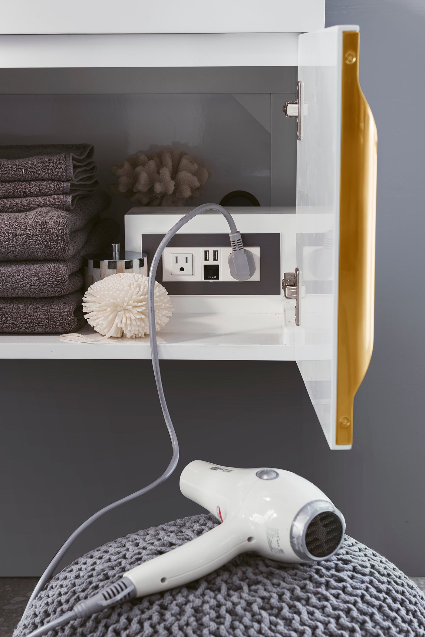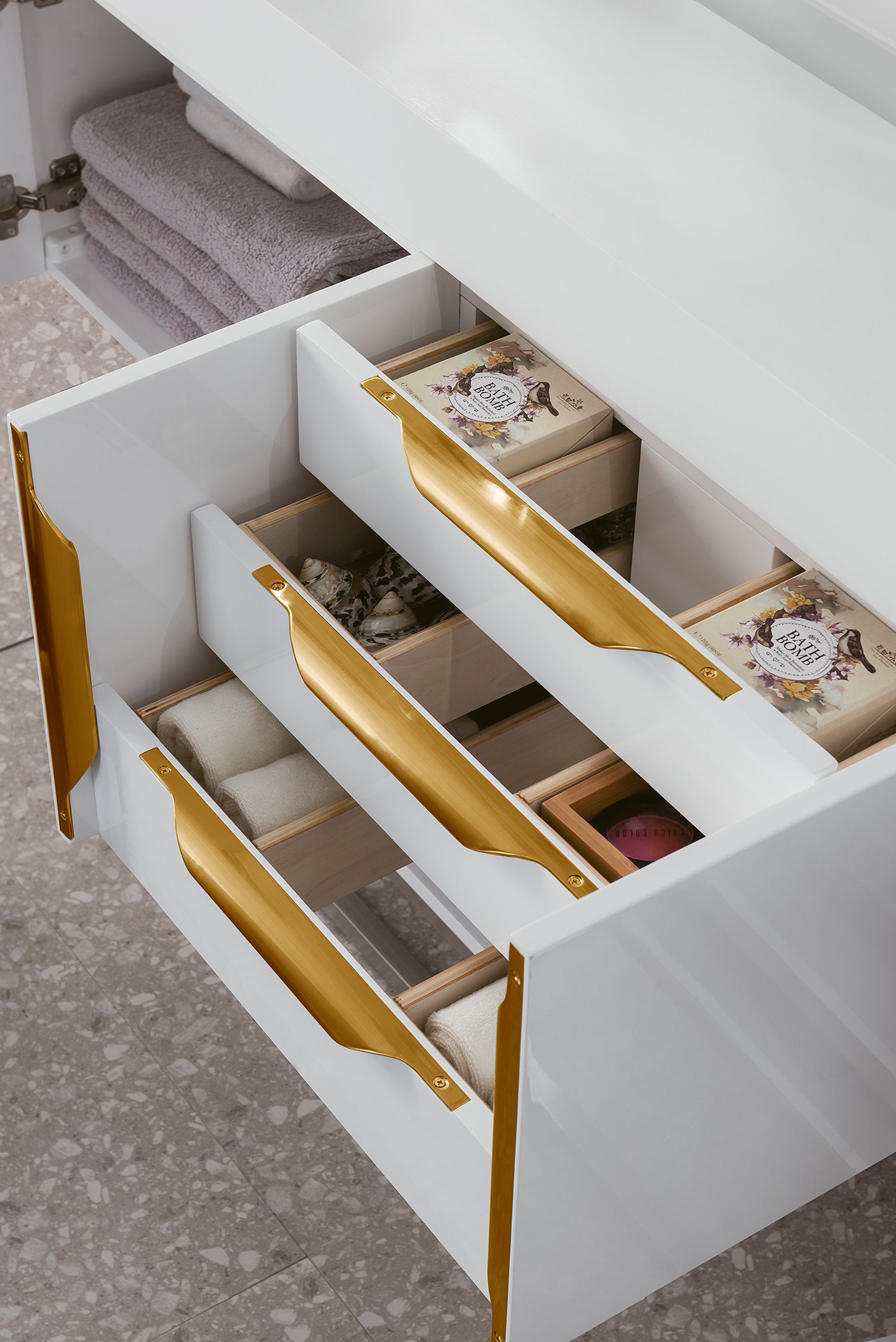 The Columbia 72" Glossy White Double Vanity offers maximum storage with two soft-closing doors and three soft-closing drawers. This cabinet includes premium features such as one solid bamboo drawer organizer and one 120 Volt UL Rated electrical component with two electrical and two USB outlets. Cabinet includes Radiant Gold door and drawer pulls. Glossy White Composite Stone countertop with integrated wide, angled trough-style sink. This wall-mounted vanity includes heavy duty mounting brackets to create a modern look.
