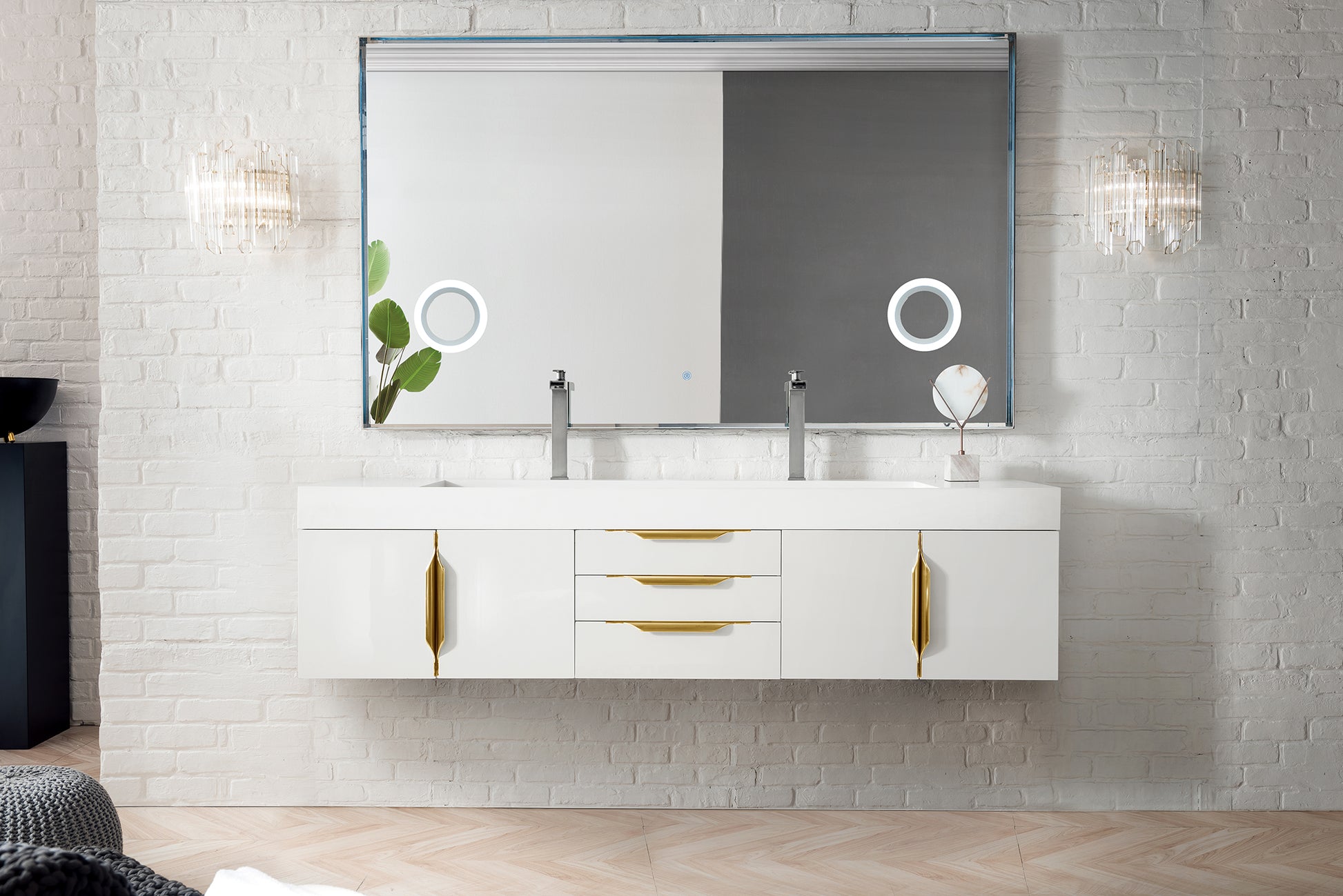 Columbia 72" Double Wall Mount Vanity, Glossy White, Radiant Gold w/ Glossy White Composite Stone Top