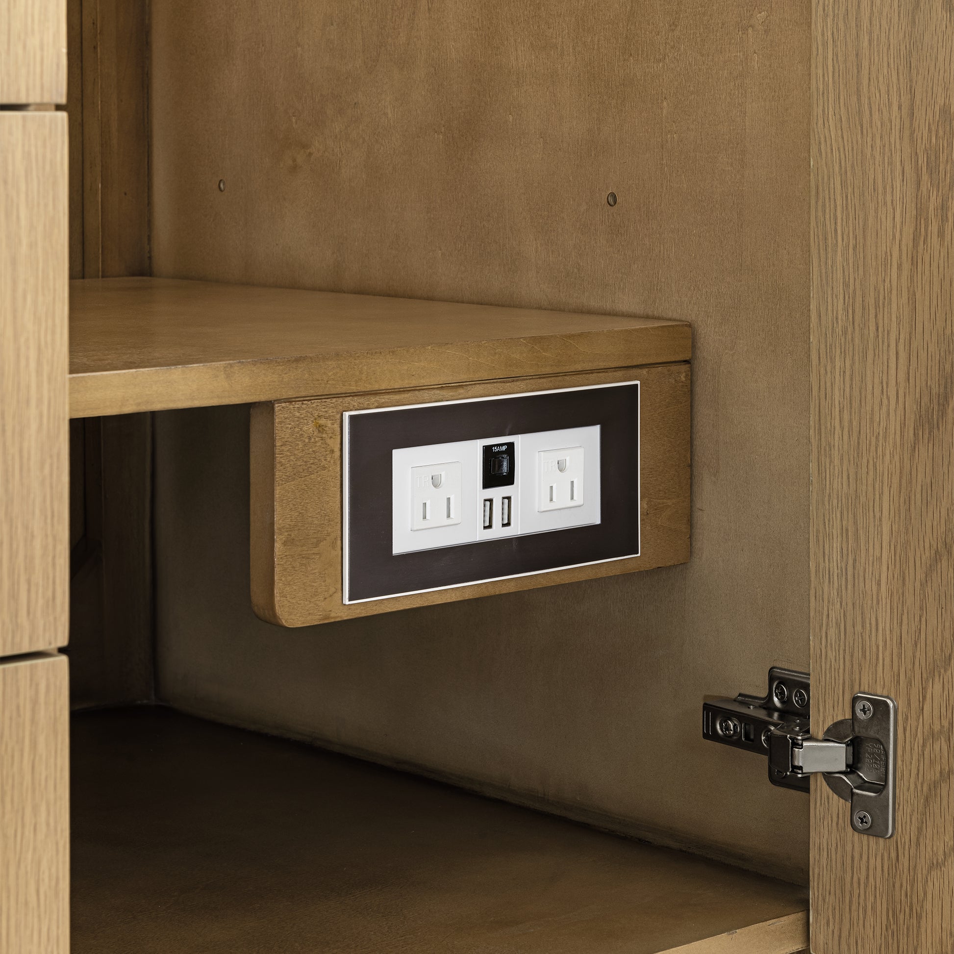 The cathedral grain Flat Cut Ash veneers and modern panel detailing on the doors and return panels give the Hudson collection the look of fine furnishings that is unexpected yet welcome for the bathroom space. The 60" Hudson Double Vanity features three generous drawers and one removable bamboo storage organizer tray, allowing for optimum organization. The right side door opens to reveal a convenient dual-power USB outlet while the left door conceals an additional drawer. The 3 CM Eternal Pearl Jasmine Silestone top provides the perfect final touch.