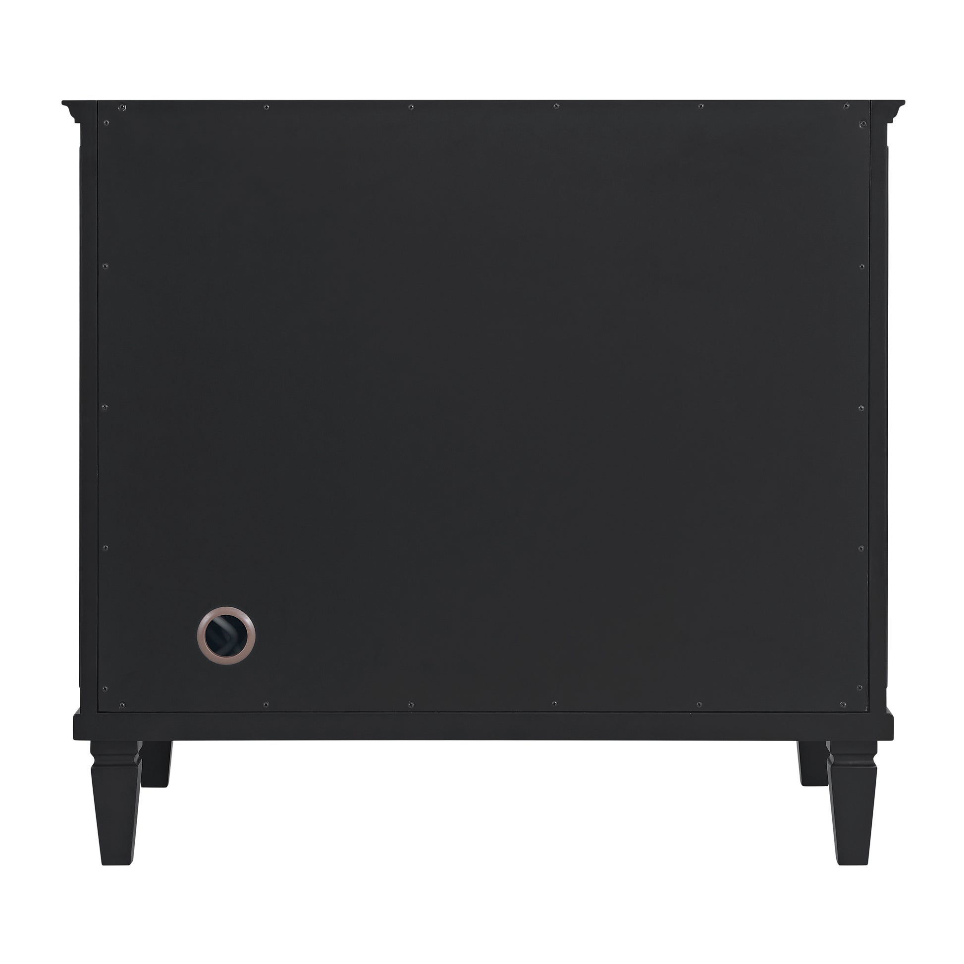 The 36" Lorelai Single Vanity celebrates timeless form and exquisite finish details, combined with practical function. The rich Black Onyx finish is accented by coin-edge knobs in Champagne Brass which provides an sophisticated contrast. Reeded details, and clean, and raised picture frame molding lend visual interest. This single-door cabinet opens to a spacious interior with a single shelf and a convenient USB/Electric power outlet. Two drawers and an upper tip-out drawer offer additional storage space. Completing this beautiful vanity is a 3cm solid surface Arctic Fall vanity top, which displays horizontal grey veining, giving you the look of classic marble with the benefits of modern technology.