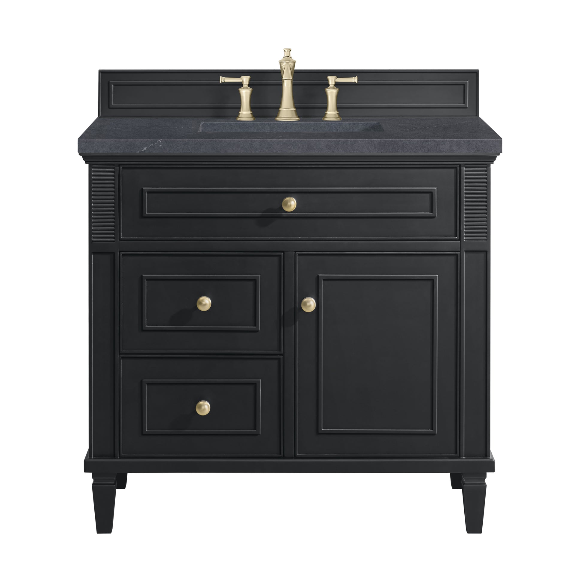 The 36" Lorelai Single Vanity celebrates timeless form and exquisite finish details, combined with practical function. The rich Black Onyx finish is accented by coin-edge knobs in Champagne Brass which provides an sophisticated contrast. Reeded details, and clean, and raised picture frame molding lend visual interest. This single-door cabinet opens to a spacious interior with a single shelf and a convenient USB/Electric power outlet. Two drawers and an upper tip-out drawer offer additional storage space. Completing this piece is a distinguished top, characterized by depth and a sense of movement with a suede finish. The Charcoal Soapstone Silestone top is a timeless statement to complete the look of your vanity.