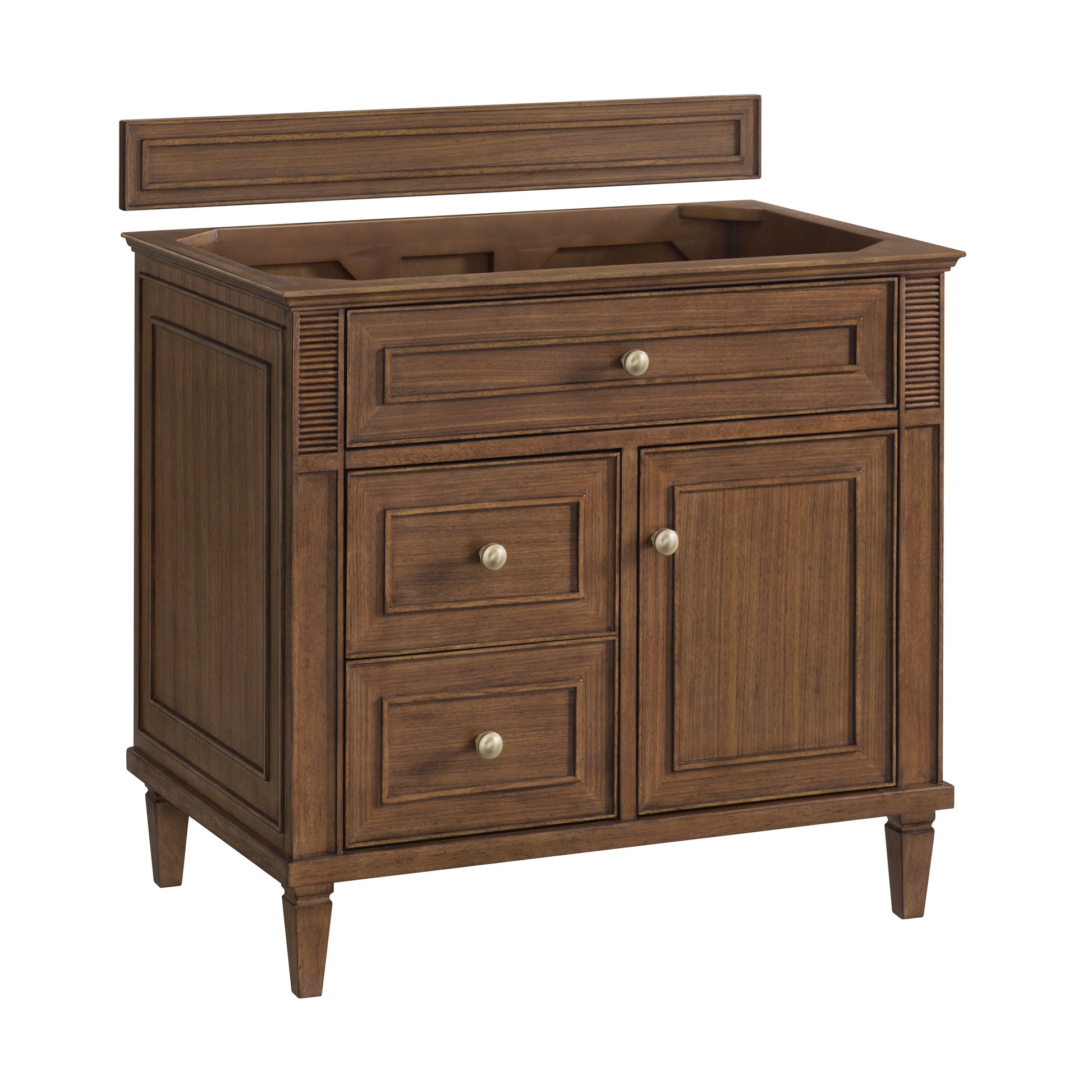 The 36" Lorelai Single Vanity celebrates timeless form and exquisite finish details, combined with practical function. The beauty of the natural grains in the walnut veneer is accented by reeded details, and clean, raised picture frame molding. The decorative, coin-edge knobs in Champagne Brass provide the perfect complement to the Mid-Century Walnut finish. This single-door cabinet opens to a spacious interior with a single shelf and a convenient USB/Electric power outlet. Two drawers and an upper tip-out drawer offer additional storage space. With the addition of a classic White Zeus Silestone top and undermount sink, this vanity is a seamless integration of modern design and functionality.