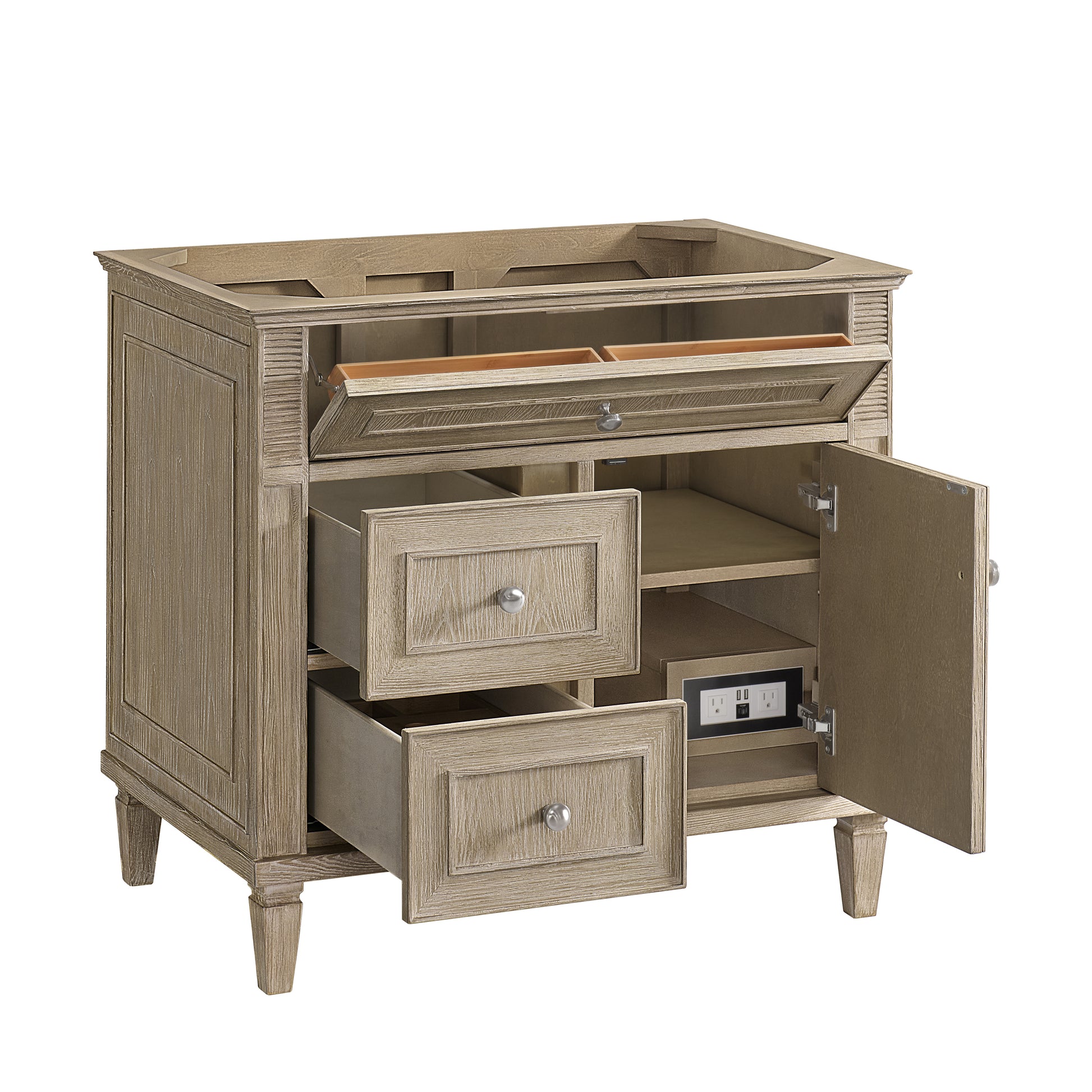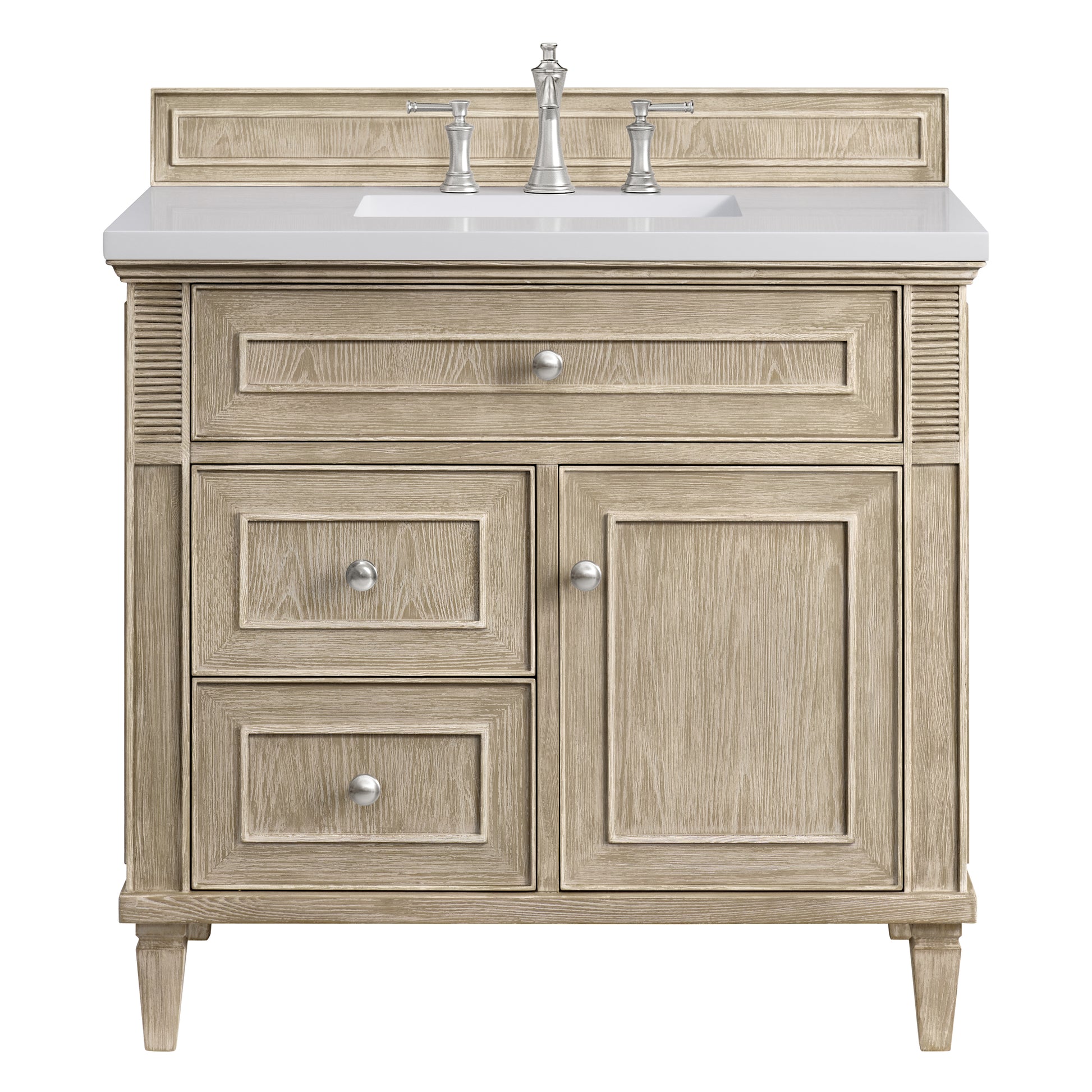 The 36" Lorelai Single Vanity celebrates timeless form and exquisite finish details, combined with practical function. The Whitewashed Oak finish is accented by reeded details, and clean, raised picture frame molding. Coin-edge knobs in Satin Nickel provide the perfect accent. This single-door cabinet opens to a spacious interior with a single shelf and a convenient USB/Electric power outlet. Two drawers and an upper tip-out drawer offer additional storage space. With the addition of a classic White Zeus Silestone top and undermount sink, this vanity is a seamless integration of modern design and functionality.
