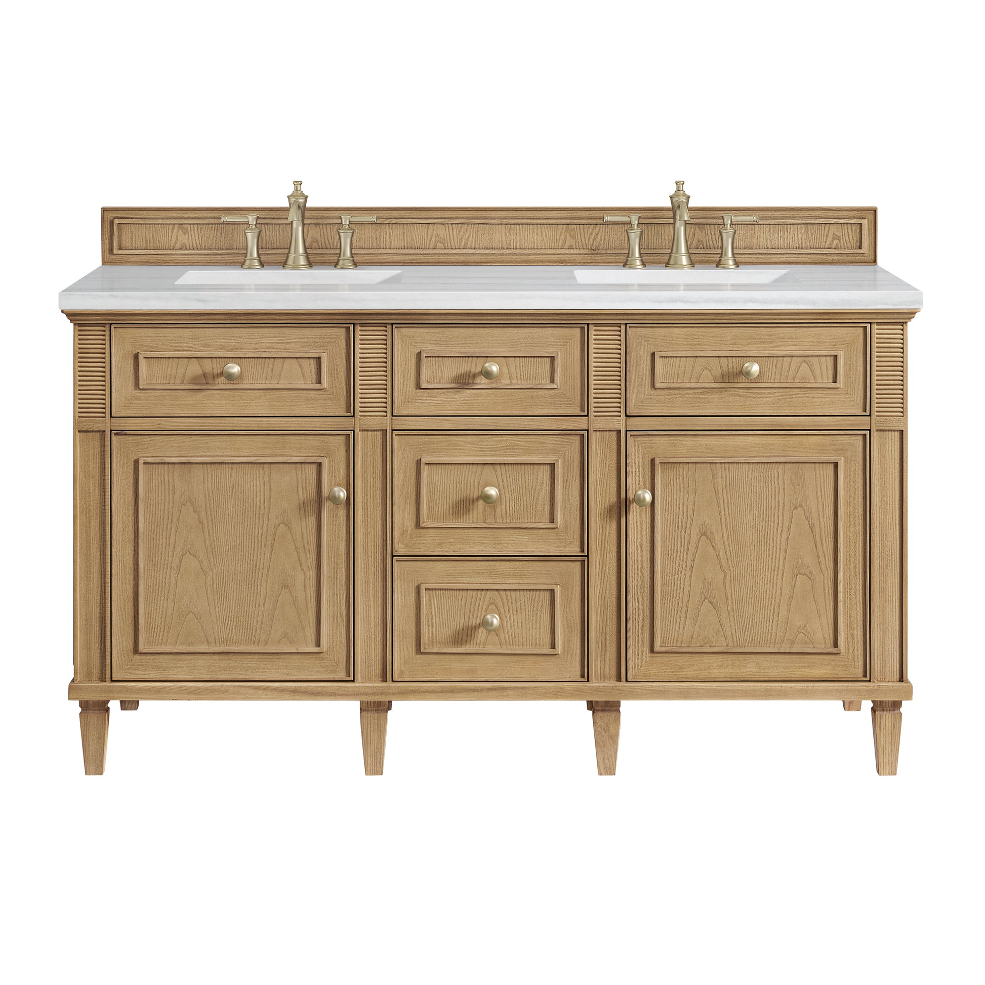 The 60" Lorelai Double Vanity celebrates timeless form and exquisite finish details, combined with practical function. The Light Natural Oak finish is accented by reeded details, and clean, raised picture frame molding. Coin-edge knobs in Champagne Brass provide the perfect accent. This two-door cabinet opens to a spacious interior with shelves and convenient USB/Electric power outlets. Three traditional drawers and two tip-outs offer additional storage space. Completing this beautiful vanity is a 3cm solid surface Arctic Fall vanity top, which displays horizontal grey veining, giving you the look of classic marble with the benefits of modern technology.