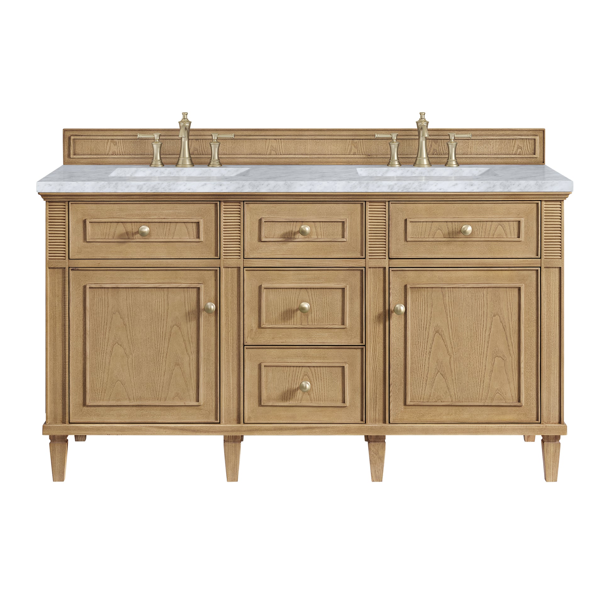 The 60" Lorelai Double Vanity celebrates timeless form and exquisite finish details, combined with practical function. The Light Natural Oak finish is accented by reeded details, and clean, raised picture frame molding. Coin-edge knobs in Champagne Brass provide the perfect accent. This two-door cabinet opens to a spacious interior with shelves and convenient USB/Electric power outlets. Three traditional drawers and two tip-outs offer additional storage space. Completing this vanity, are the treasured, neutral tones and textures of the Carrara marble vanity top display a white background with delicate grey veining.