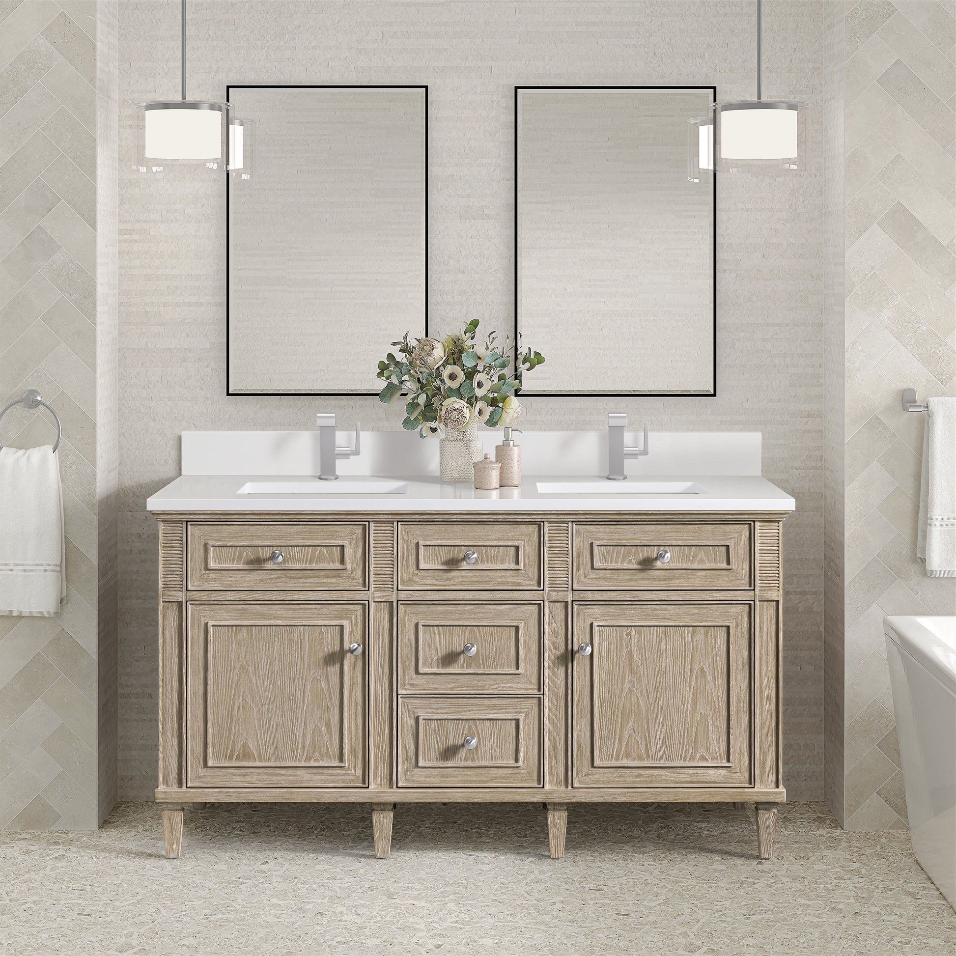 The 60" Lorelai Double Vanity celebrates timeless form and exquisite finish details, combined with practical function. The Whitewashed Oak finish is accented by reeded details, and clean, raised picture frame molding. Coin-edge knobs in Satin Nickel provide the perfect accent. This two-door cabinet opens to a spacious interior with shelves and convenient USB/Electric power outlets. Three traditional drawers and two tip-outs offer additional storage space. With the addition of a classic White Zeus Silestone top with backsplash and undermount sink, this vanity is a seamless integration of modern design and functionality.